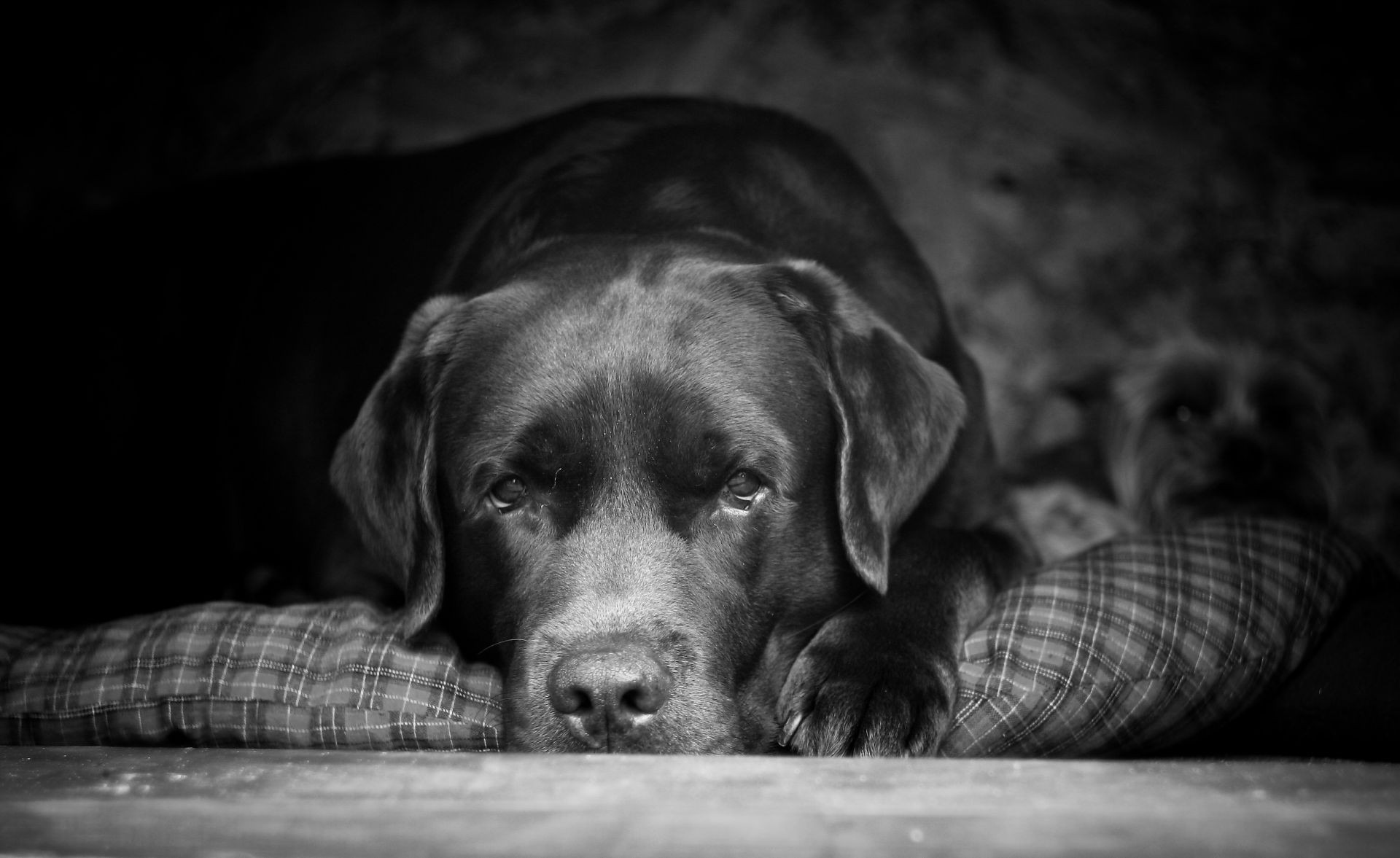 Cão lambe enquanto está preso em um fundo de rua borrado