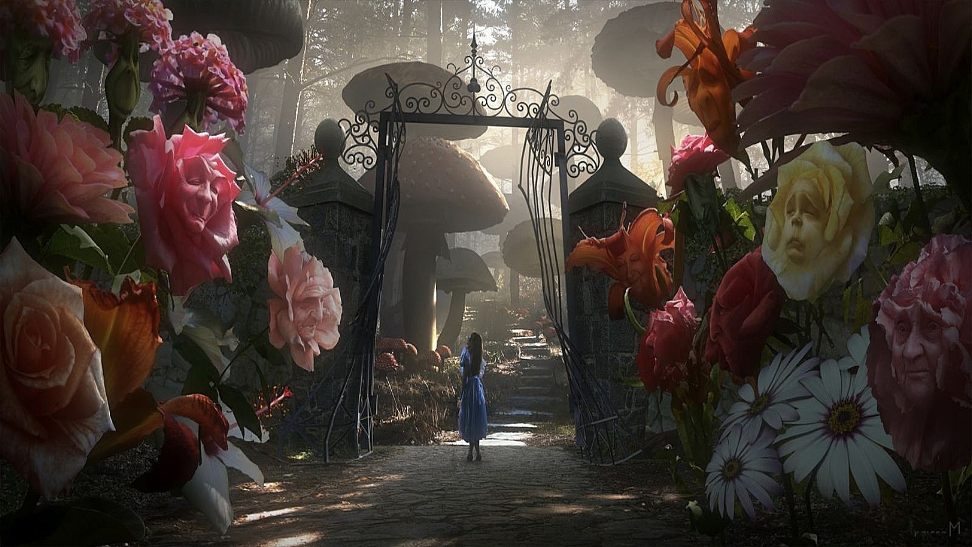 Alice no país das maravilhas grandes cogumelos e flores meninaAlice no país das maravilhas grandes cogumelos e flores menina