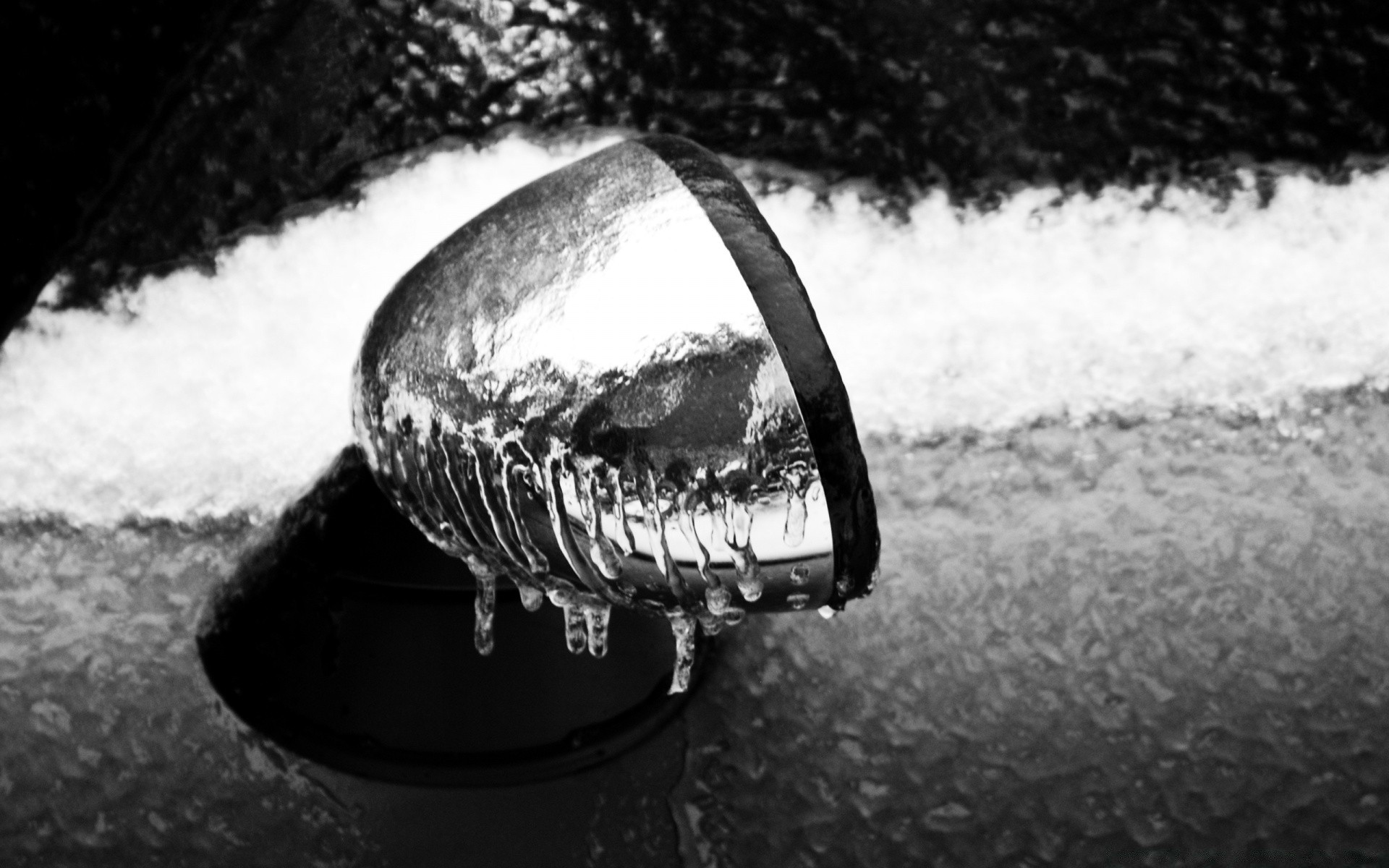 Pôr do sol de Inverno. Moinho de água congelado na água