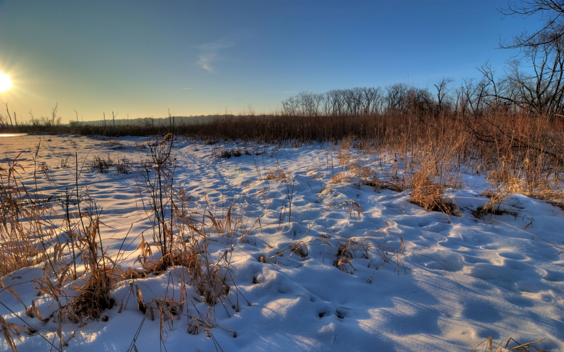 Campo coberto de neve com um pôr-do-sol cor-de-rosa