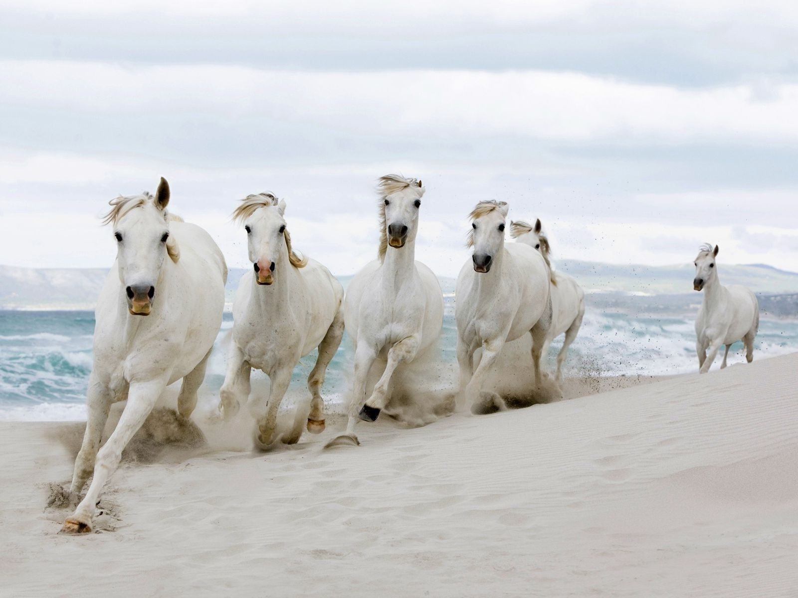 Cavalos brancos correndo na areia branca da praia