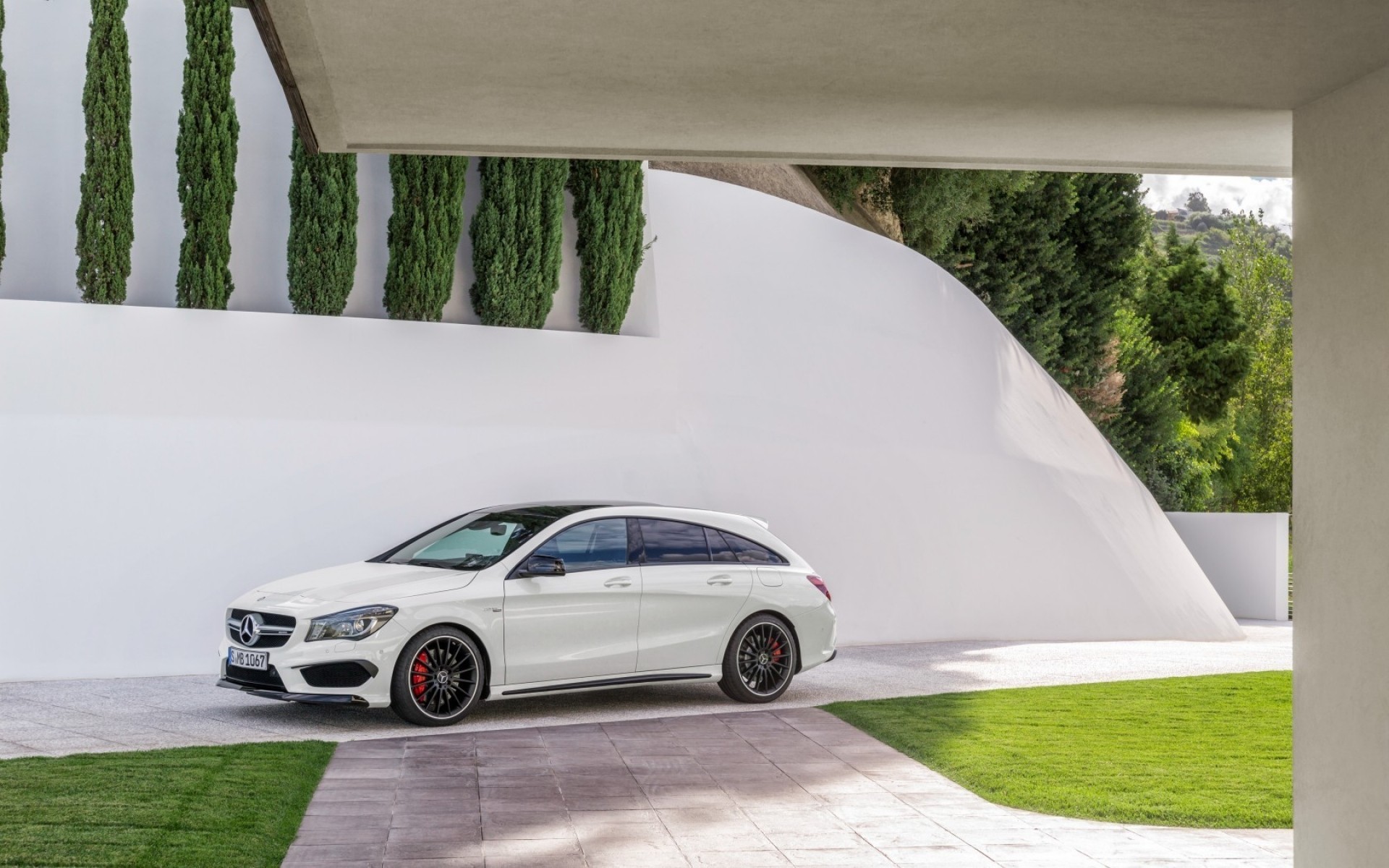 Carro branco mercedes-benz no pátio contra um fundo de parede branca