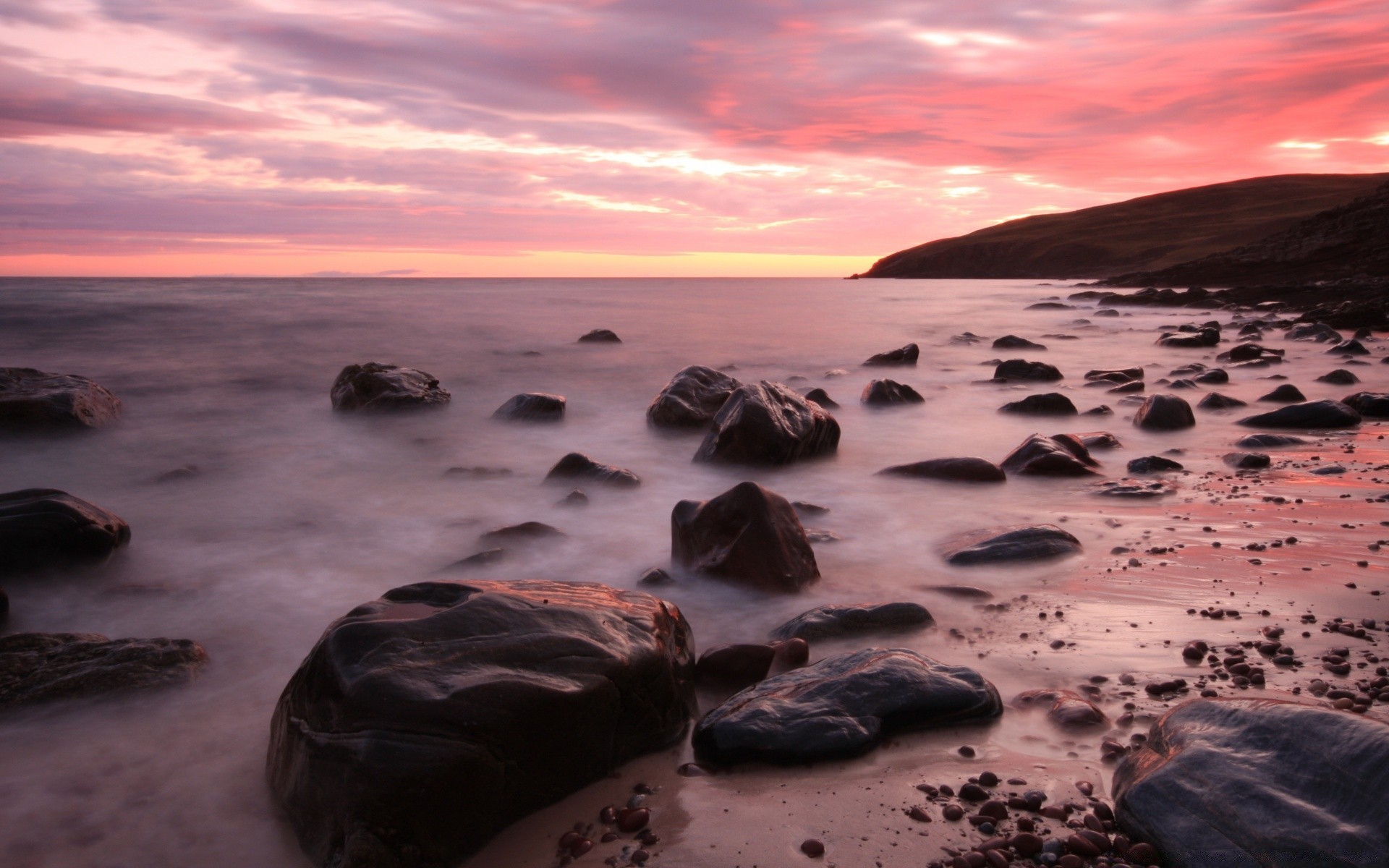 Grandes pedregulhos na espuma do mar ao pôr do sol