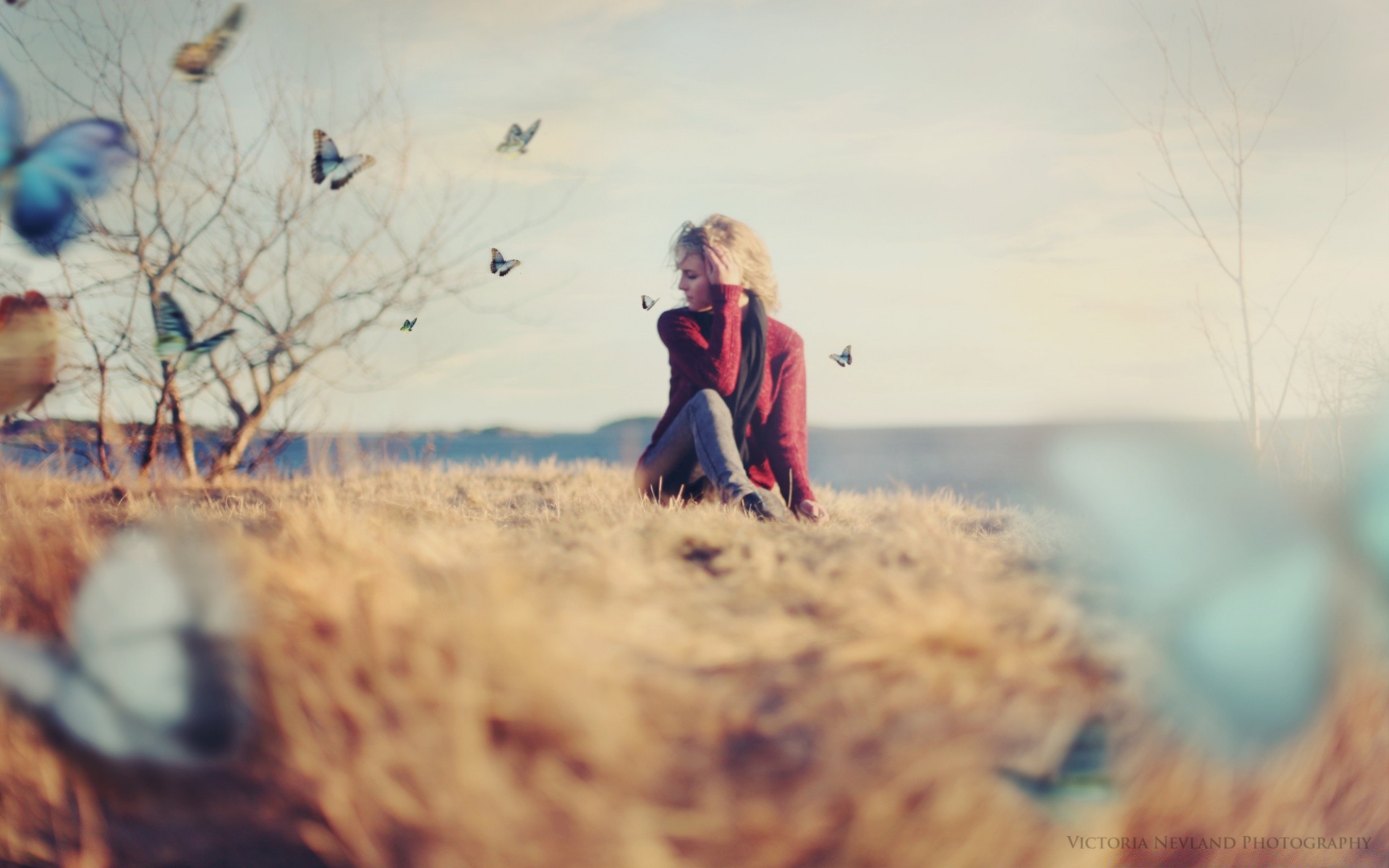 Menina sentada mão perto do cabelo