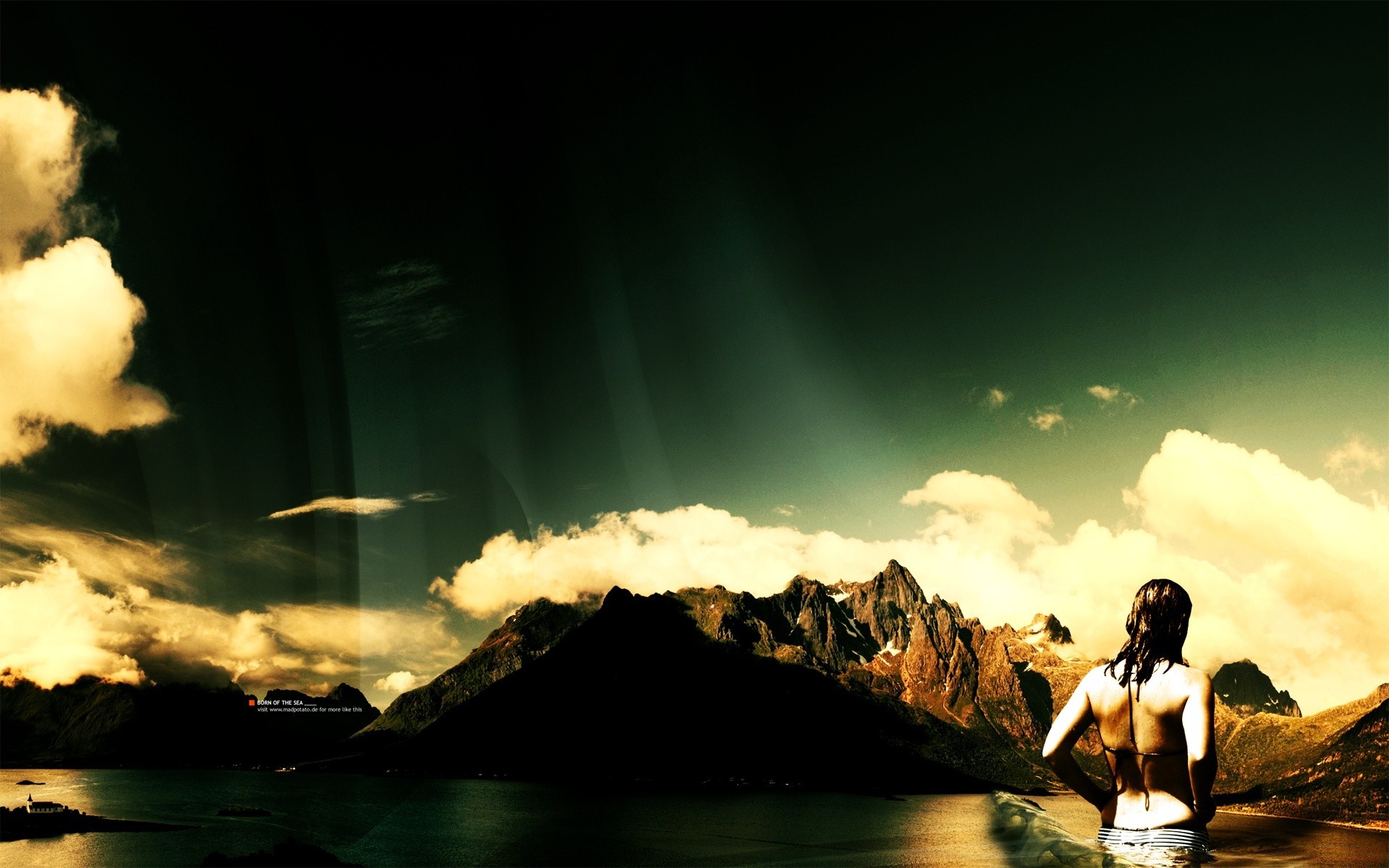 Menina na água no fundo das montanhas