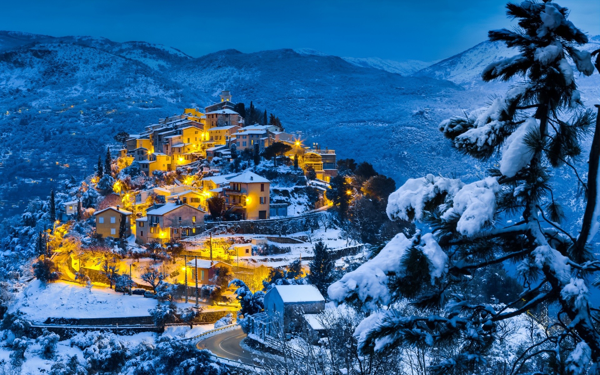 Árvore de Natal brilhante com luzes sobre fundo azul