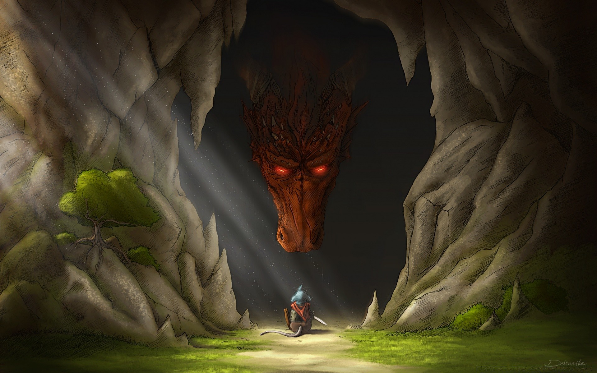 Desenho de um corvo sentado na cabeça de um ídolo