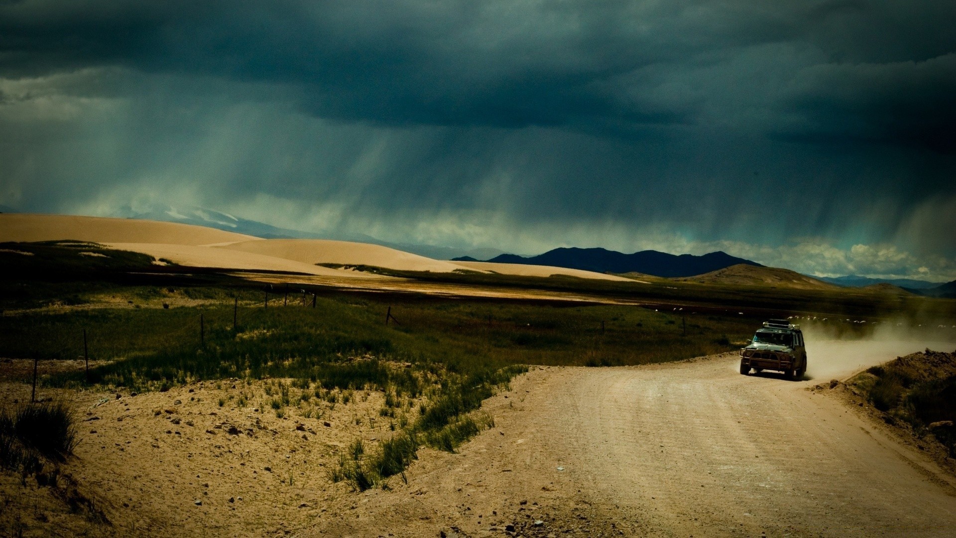 O carro está na estrada, e atrás dele há uma escuridão de poeira.