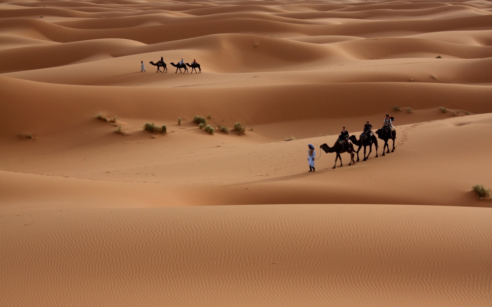 No deserto seco, camelos cansados levam
