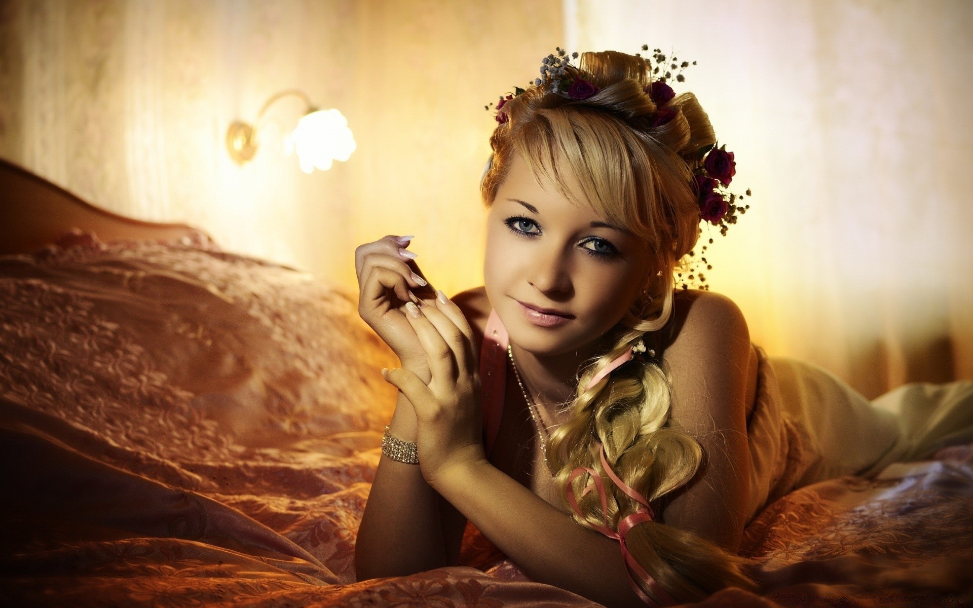 Menina na cama com uma trança e uma coroa de flores na cabeça