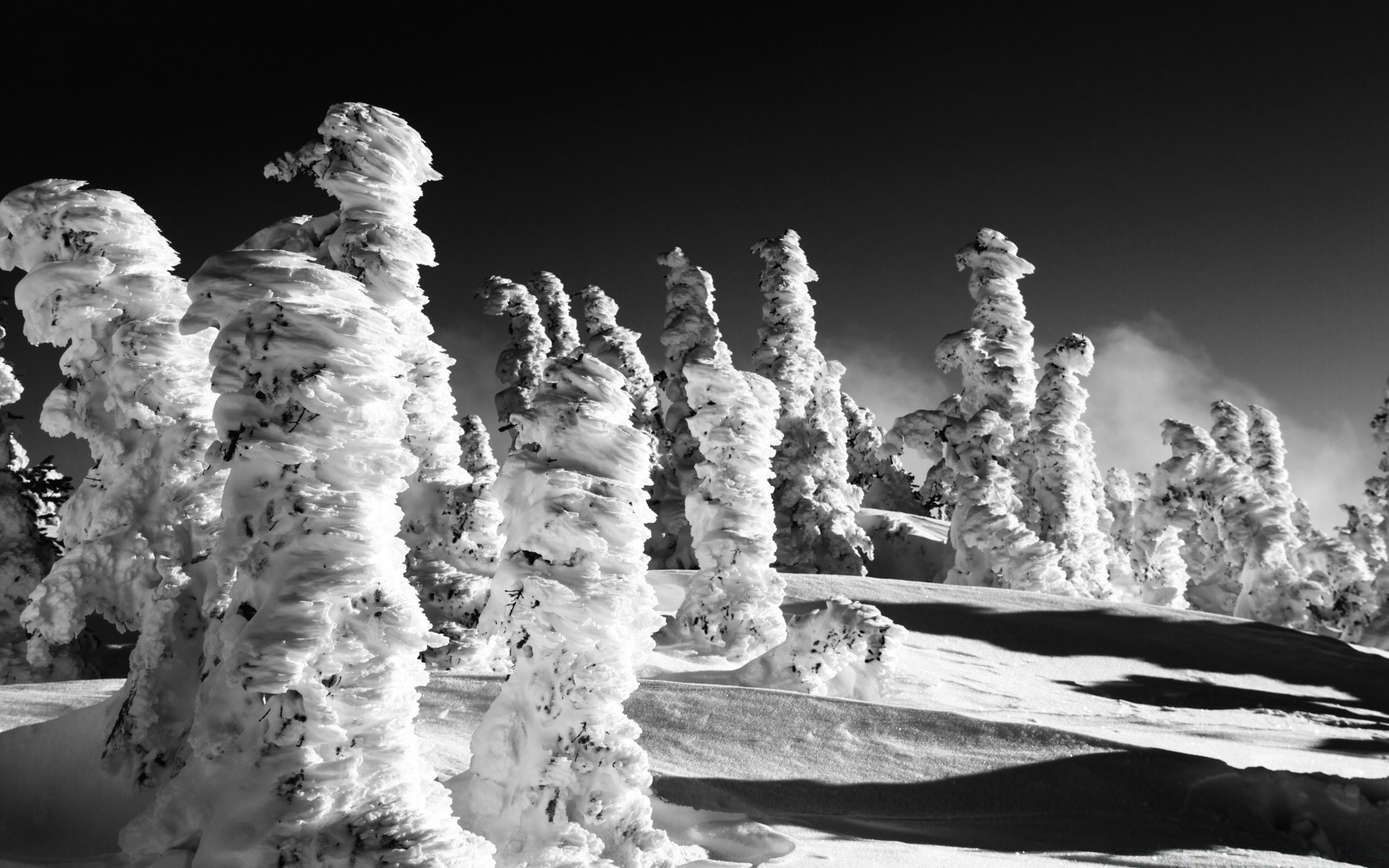 Foto em preto e branco floresta de inverno em um dia ensolarado