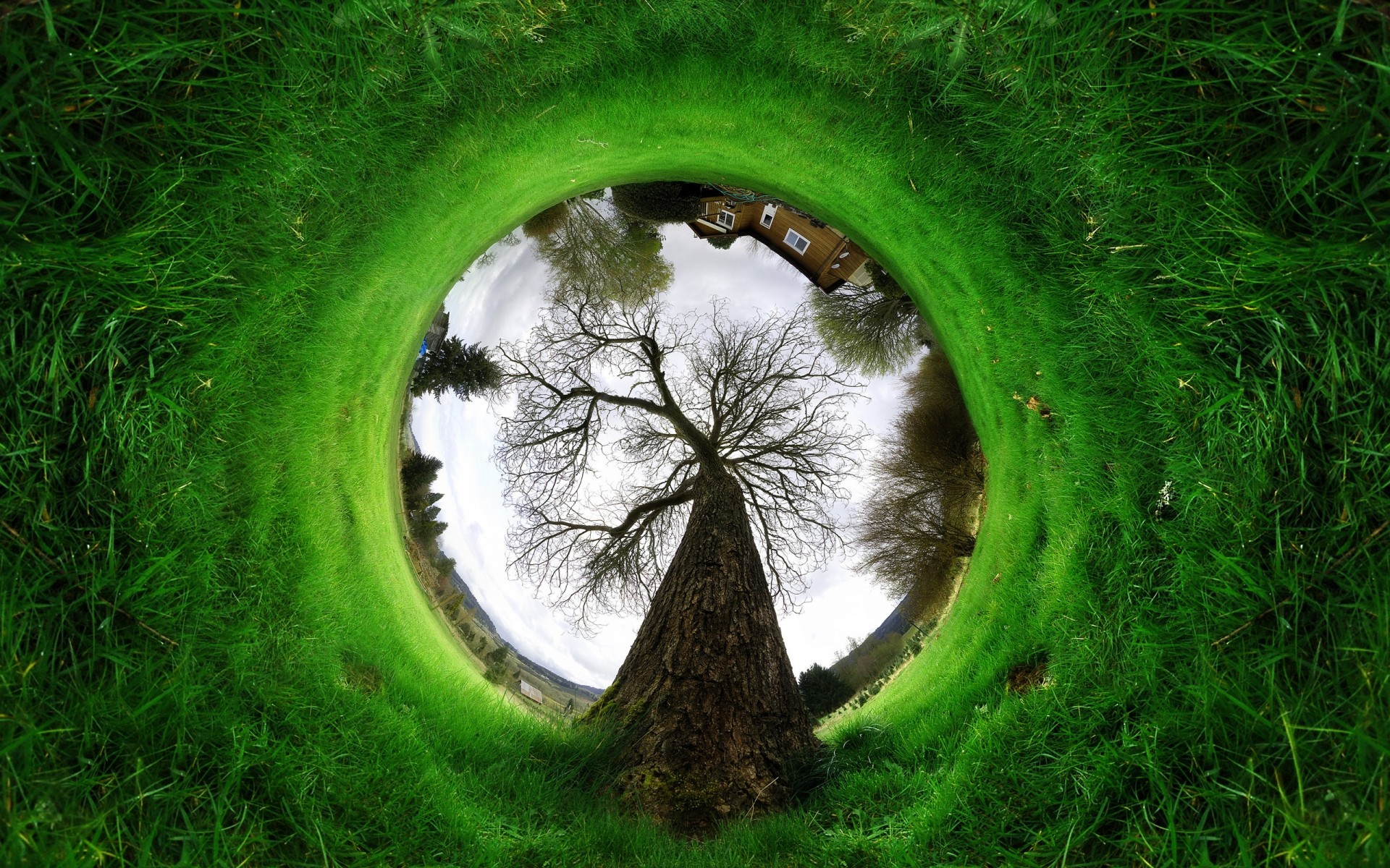 Grama verde e um planeta no céu azul