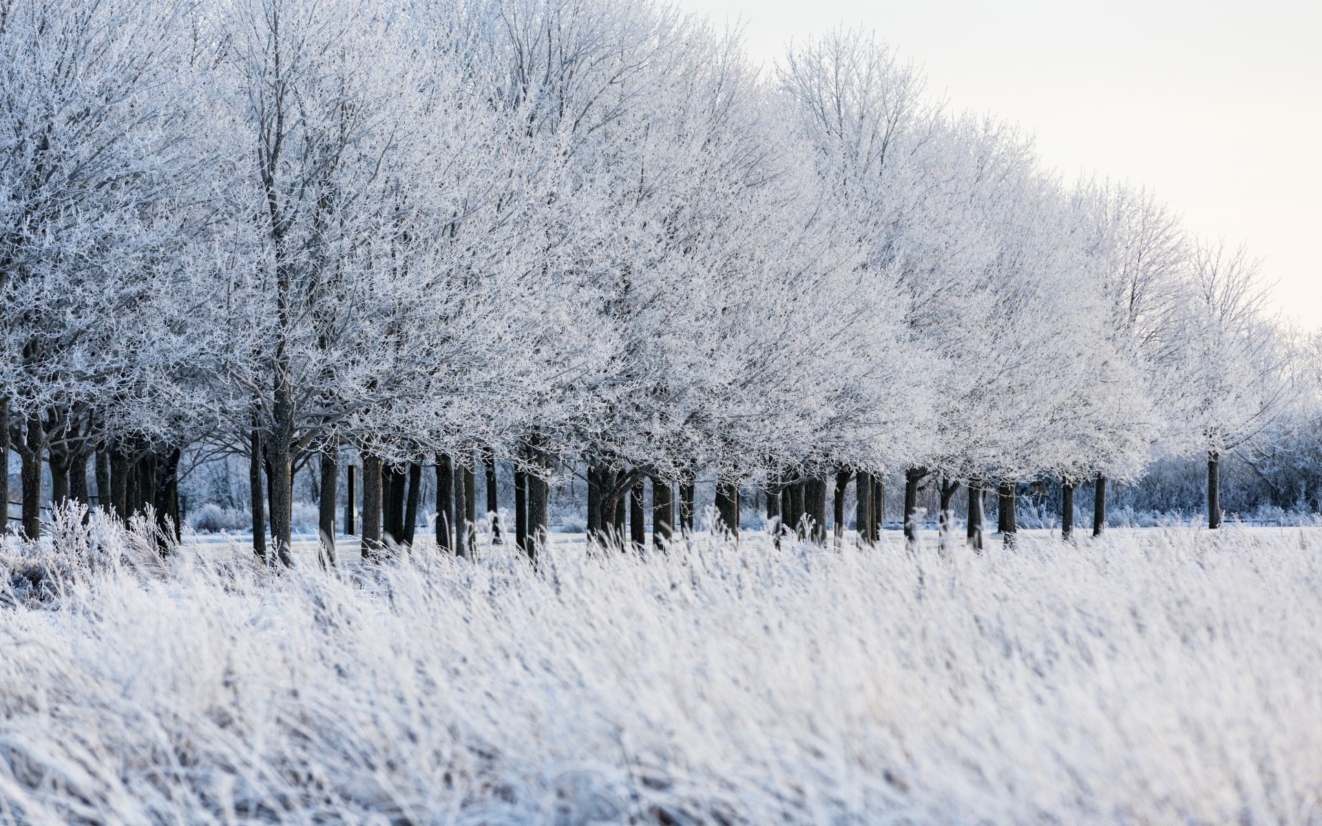Árvores em uma fileira cobertas de neve em um dia gelado