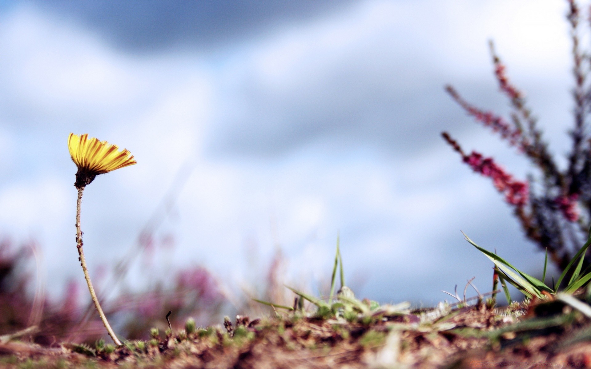 Flor amarela. Folhagem. Fundo desfocado escuro