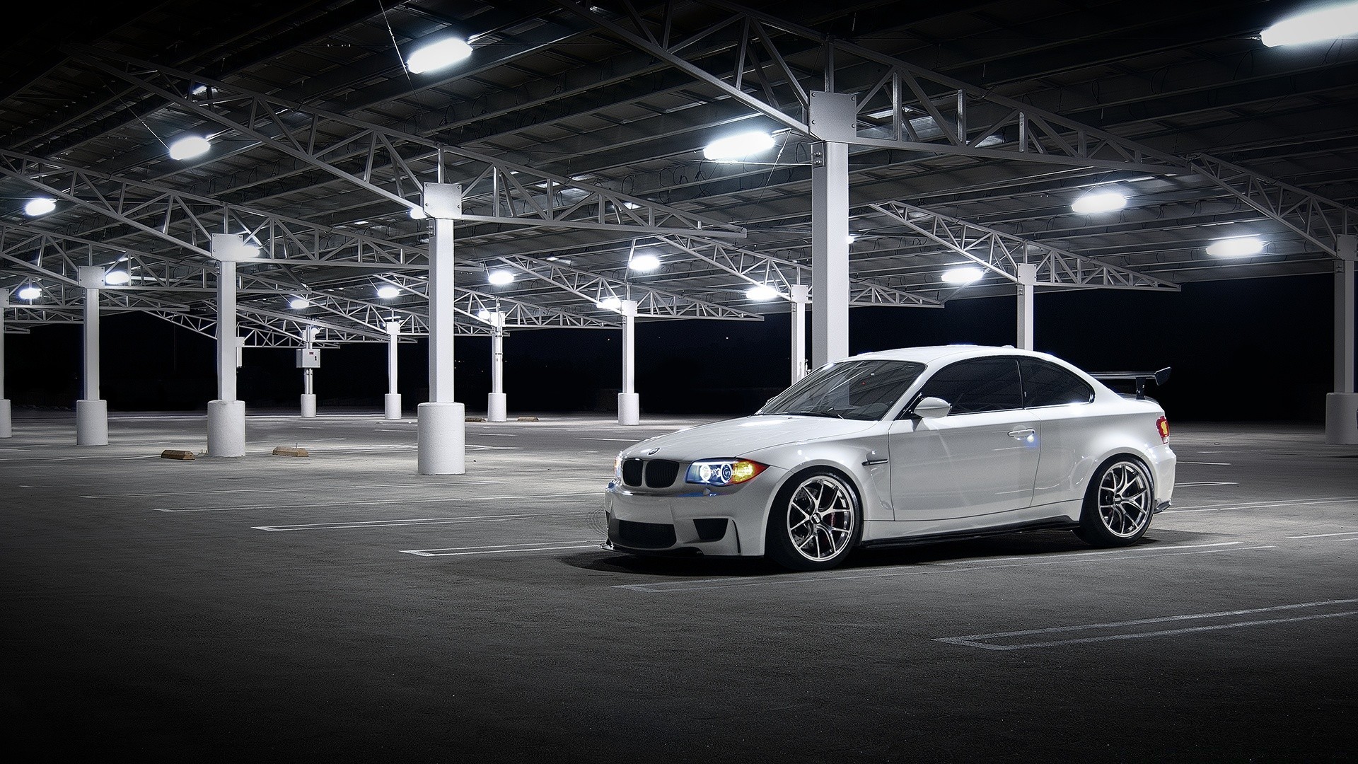 Carro branco no estacionamento com luzes