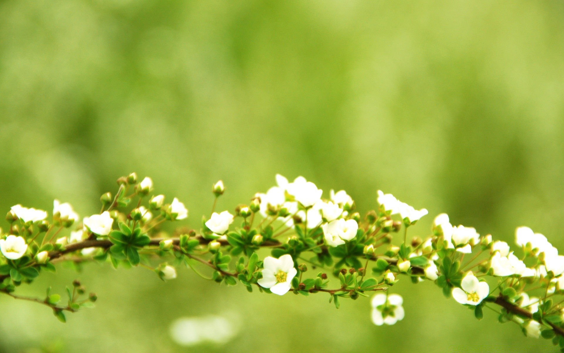 Fotografia Macro de uma planta com flores brancas em um fundo verde