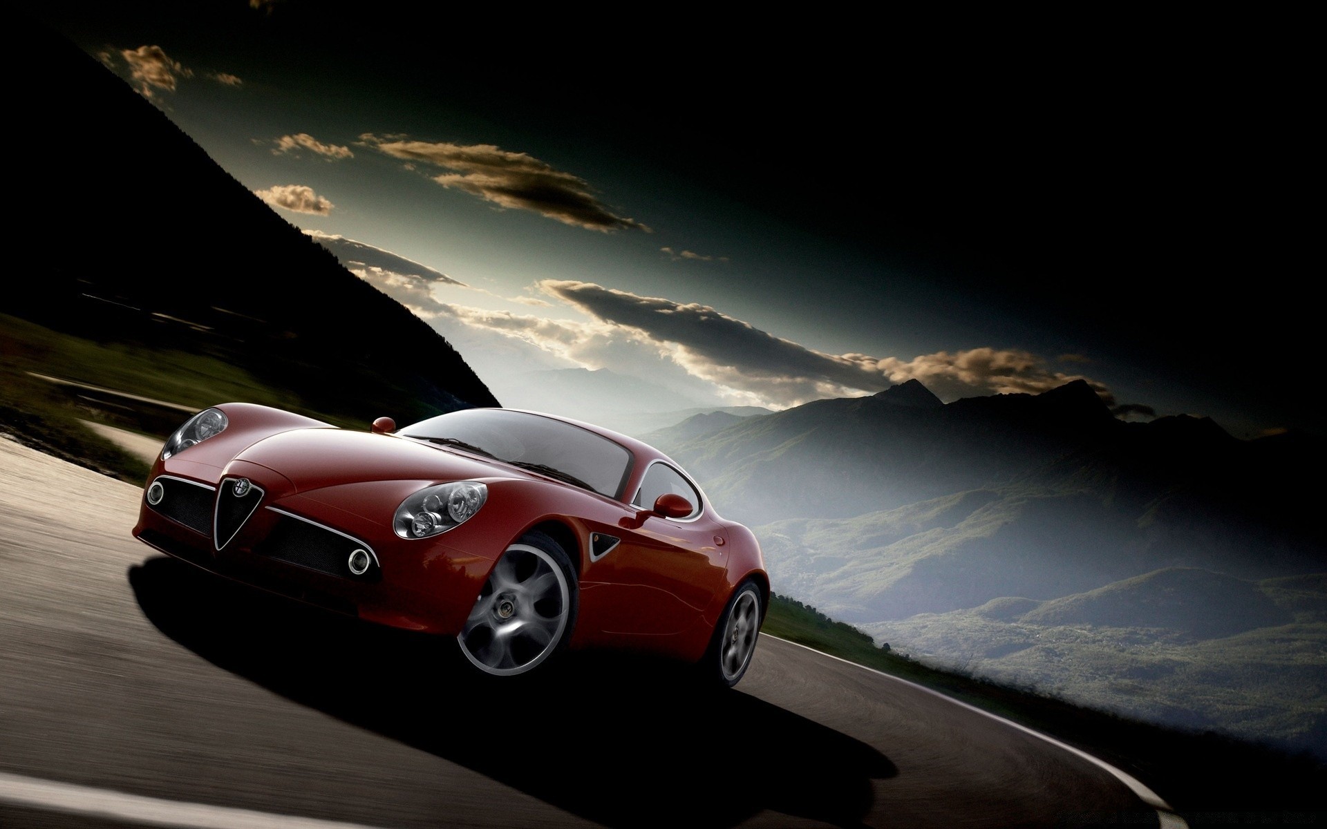 Carro esportivo vermelho corre no asfalto entre a floresta