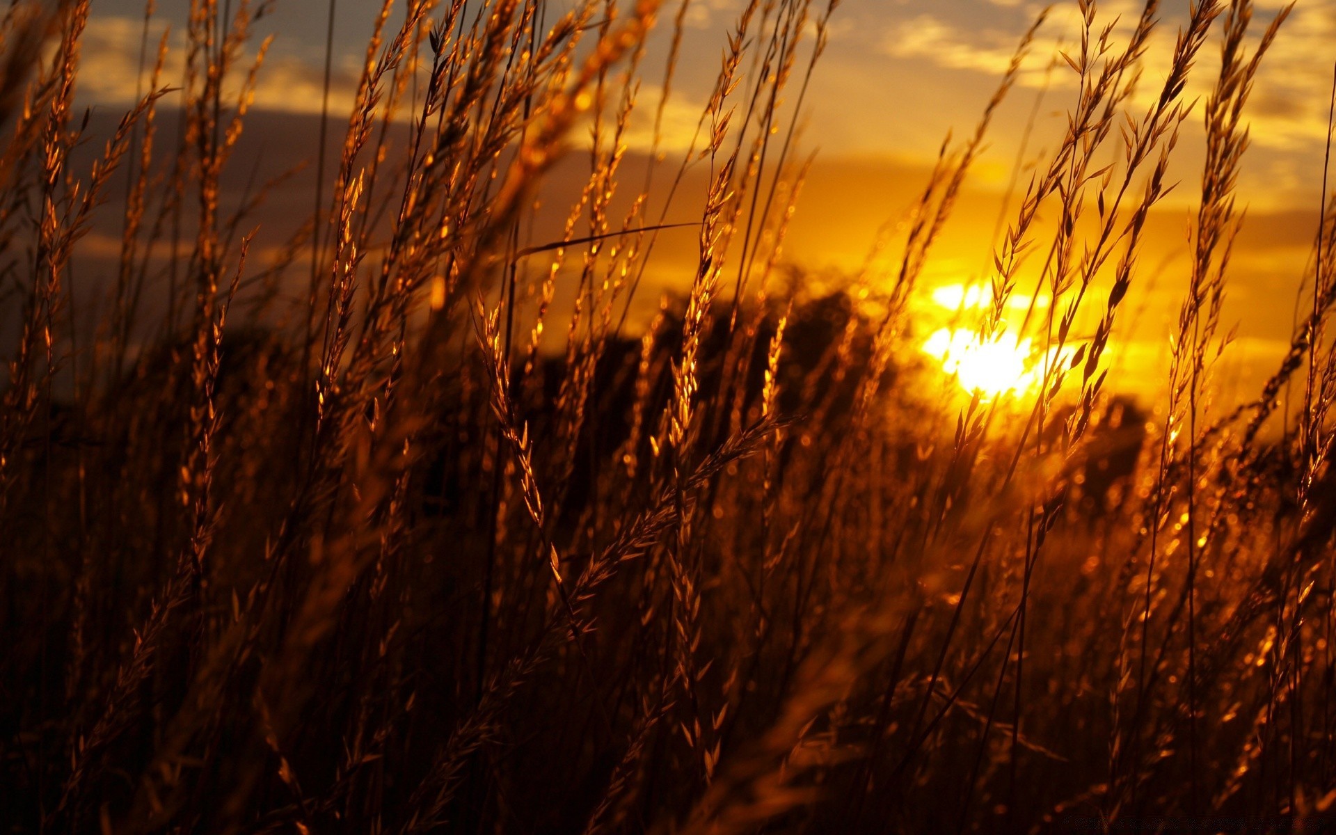 Silhuetas de espigas em um fundo desfocado do pôr do sol