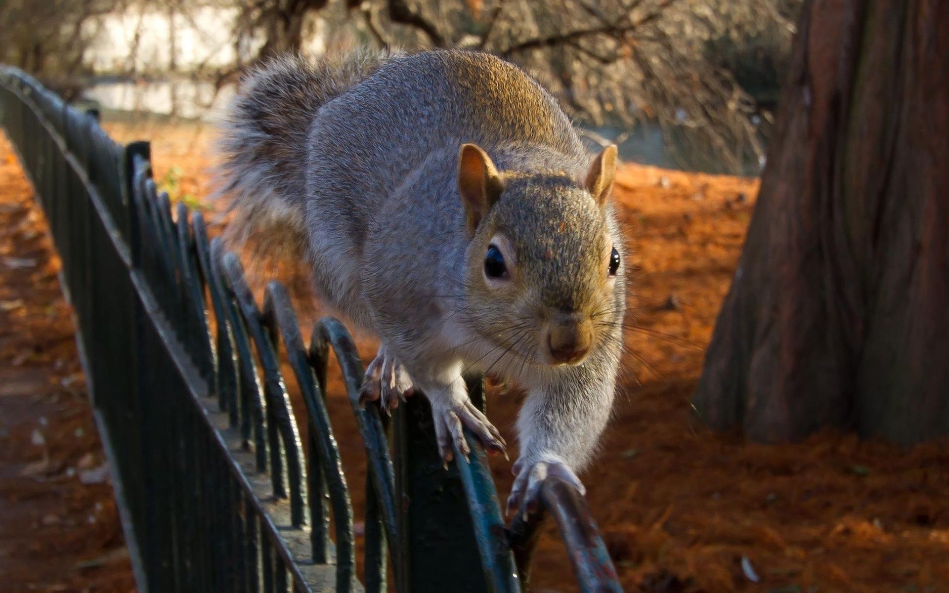 Esquilo cinzento andando pela cerca