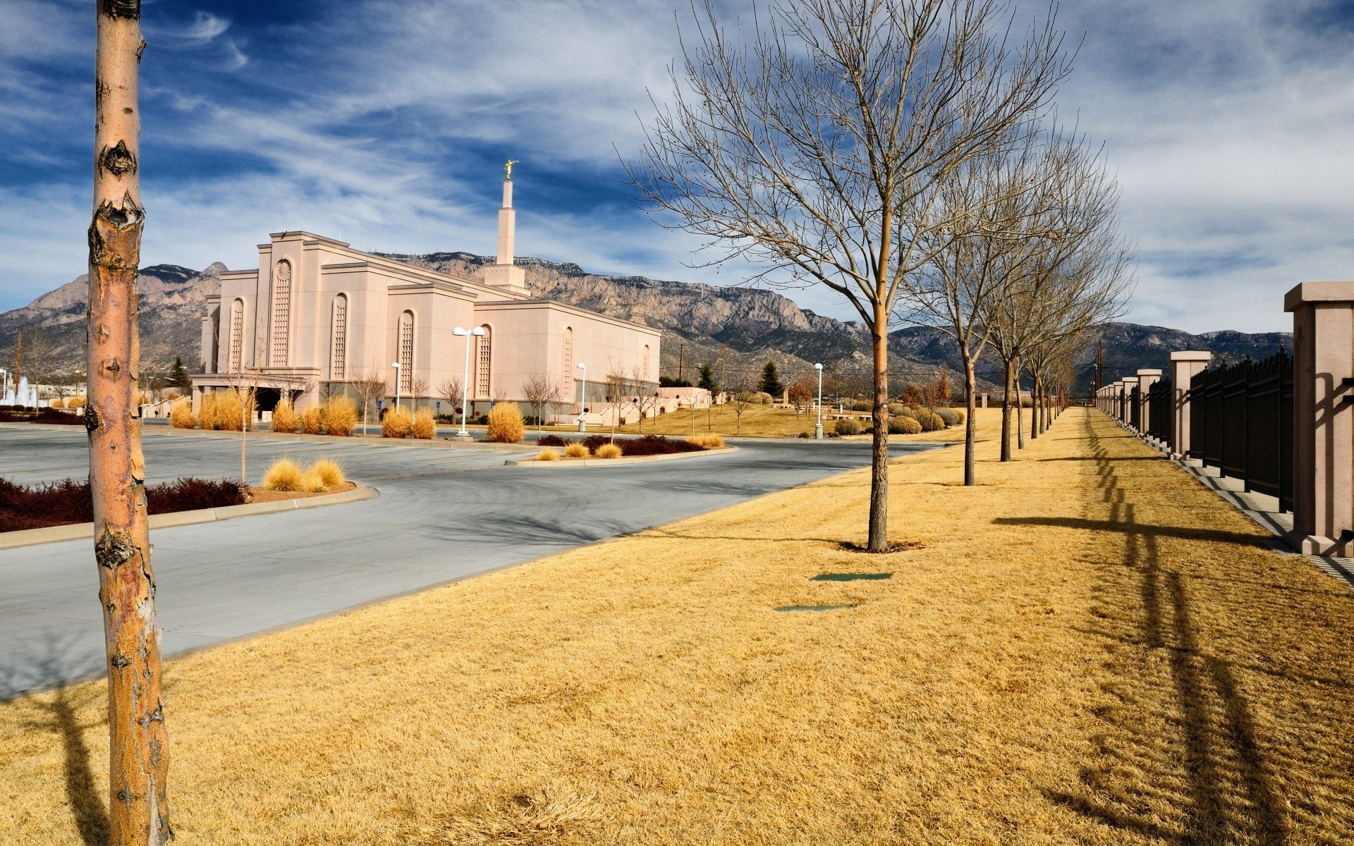 Bela paisagem com estrada, cidade e céu
