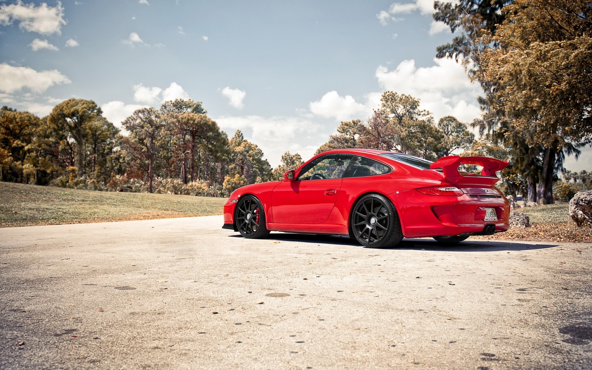 Carro Ferrari na estrada de asfalto do Parque