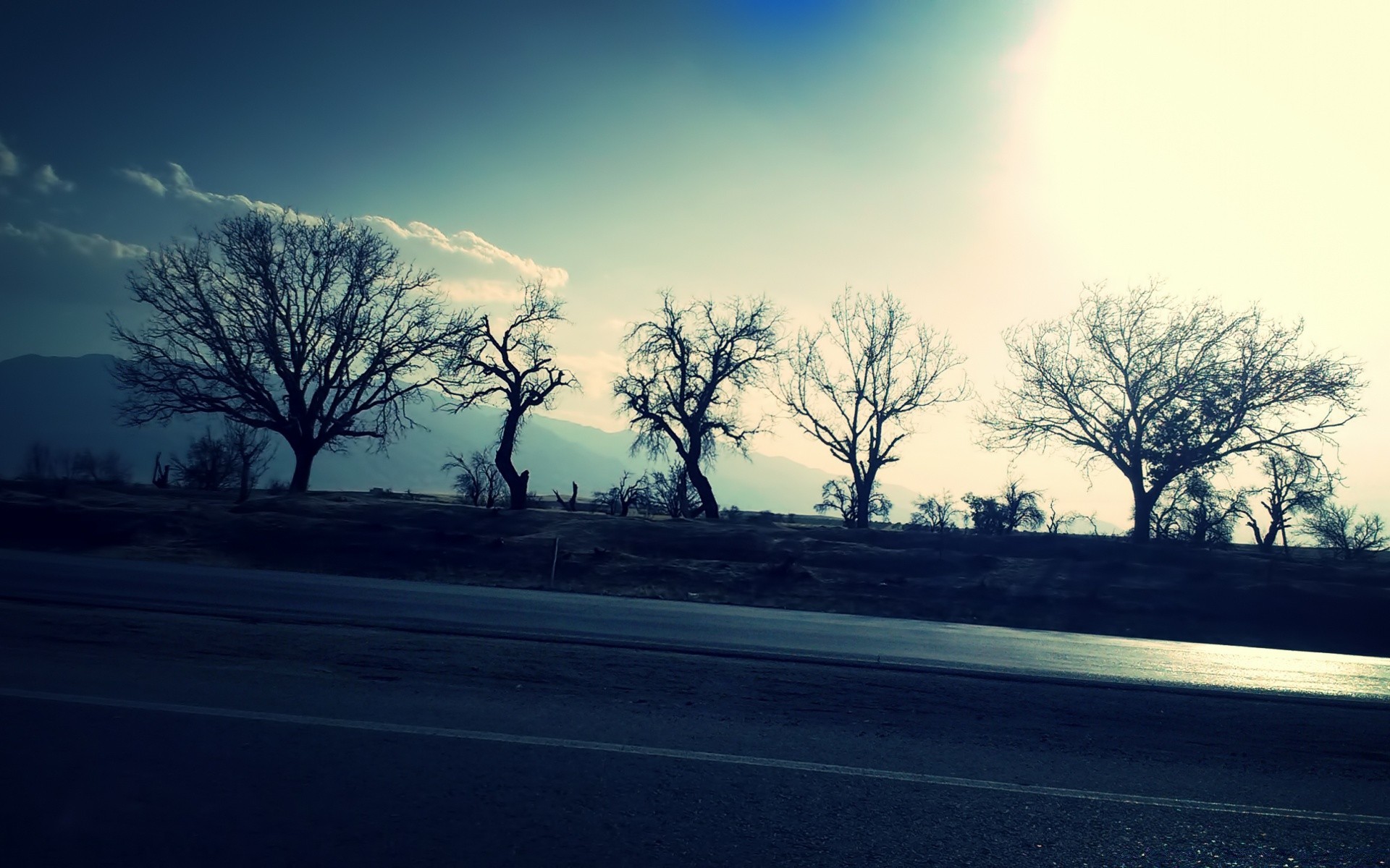 Árvores e o céu. Estrada. Paisagem