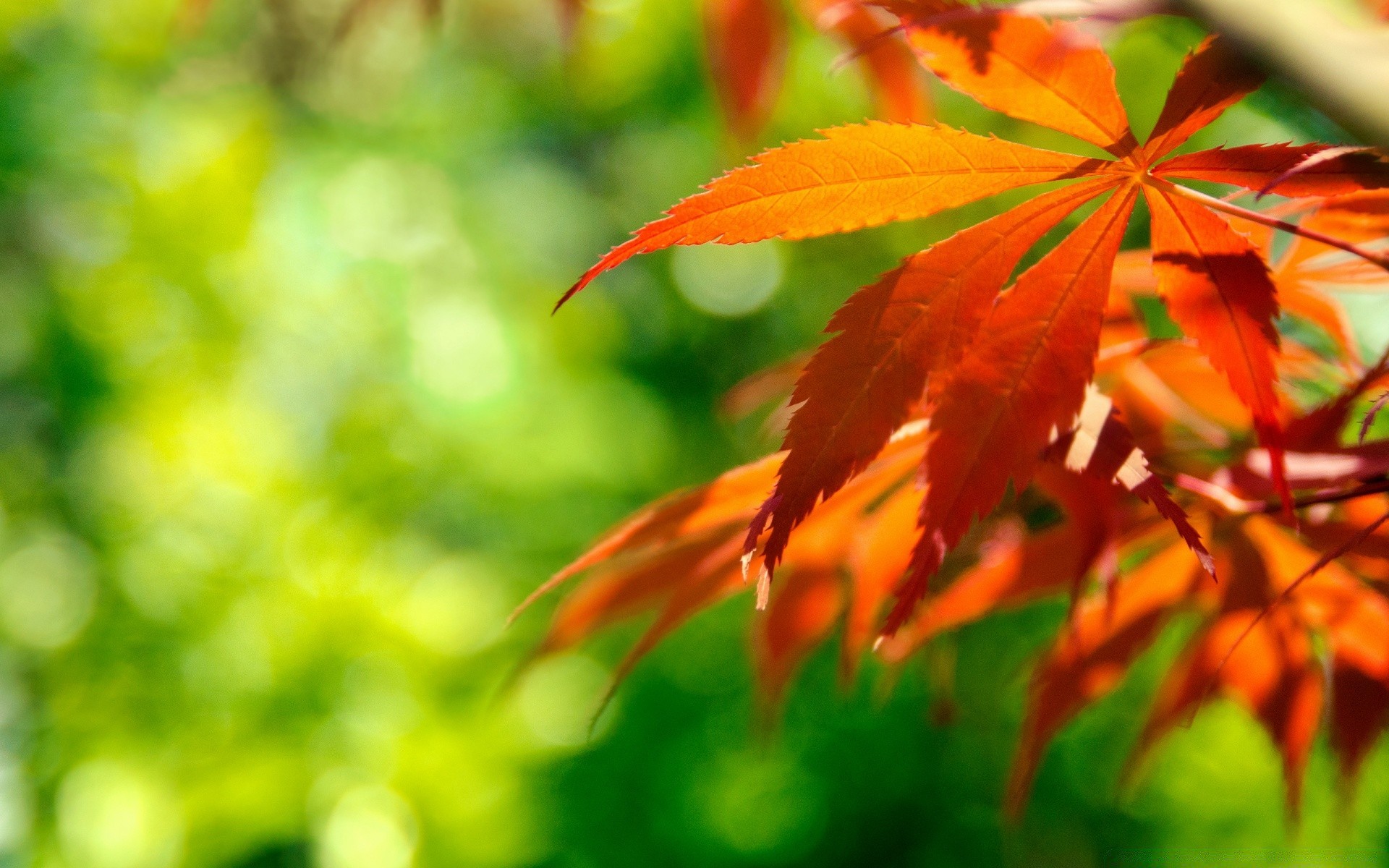 Folhas brilhantes de outono em um fundo verde borradoFolhas brilhantes de outono em um fundo verde borrado
