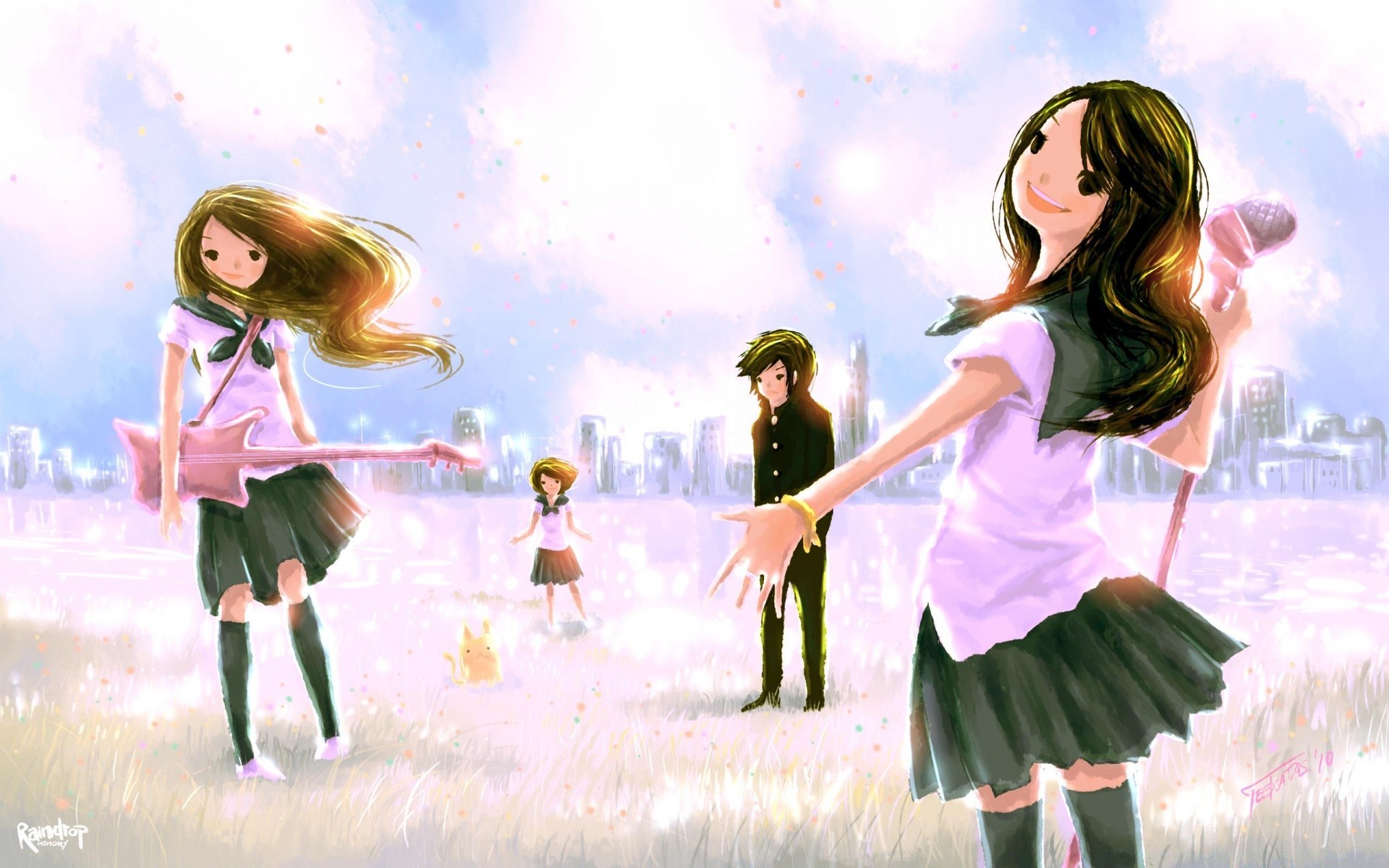 Um grupo musical. O menino e as meninas ensaiam. Anime