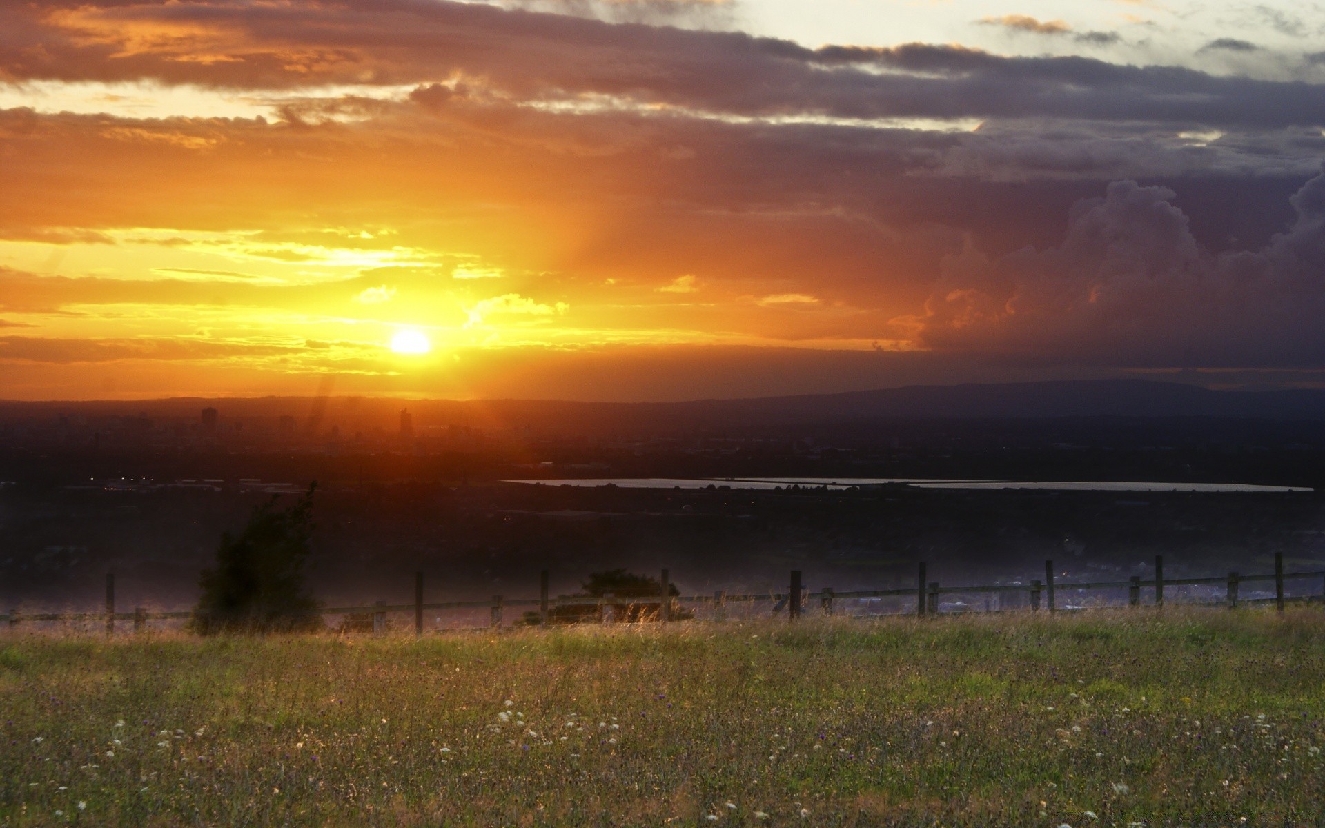 Pôr do sol brilhante sobre o campo