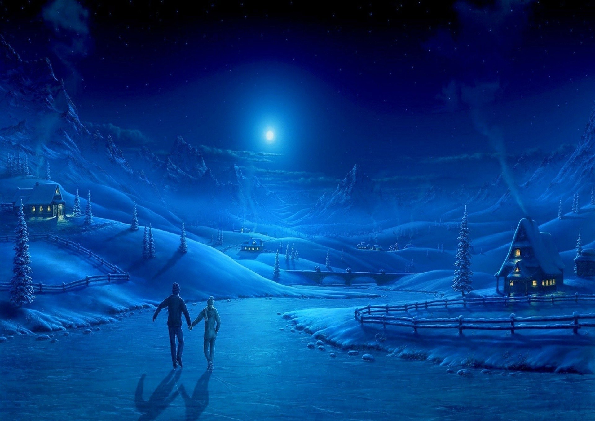 Dois amantes vão para casa depois de uma festa pela aldeia