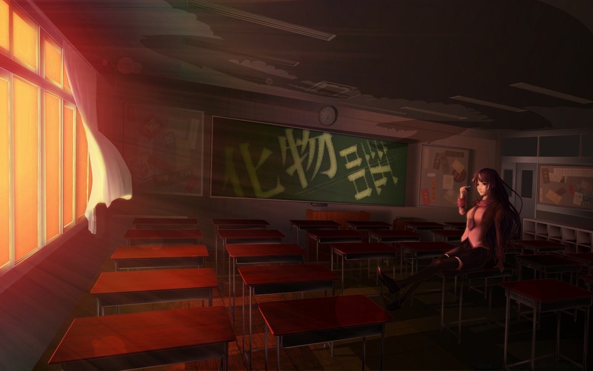 Anime menina com cabelo preto longo sentado no capô do carroAnime menina com cabelo preto longo sentado no capô do carro