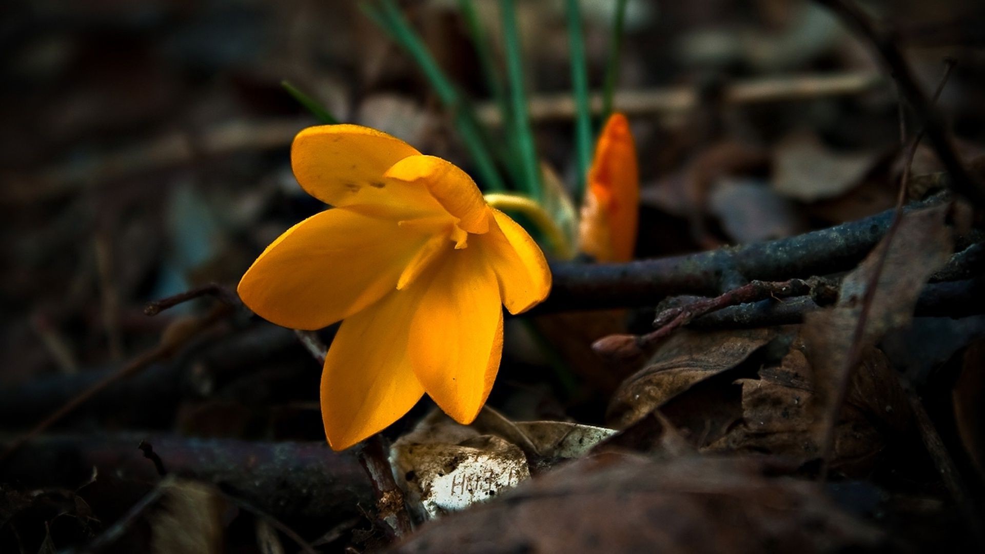Flor amarela. Folhagem. Fundo desfocado escuro