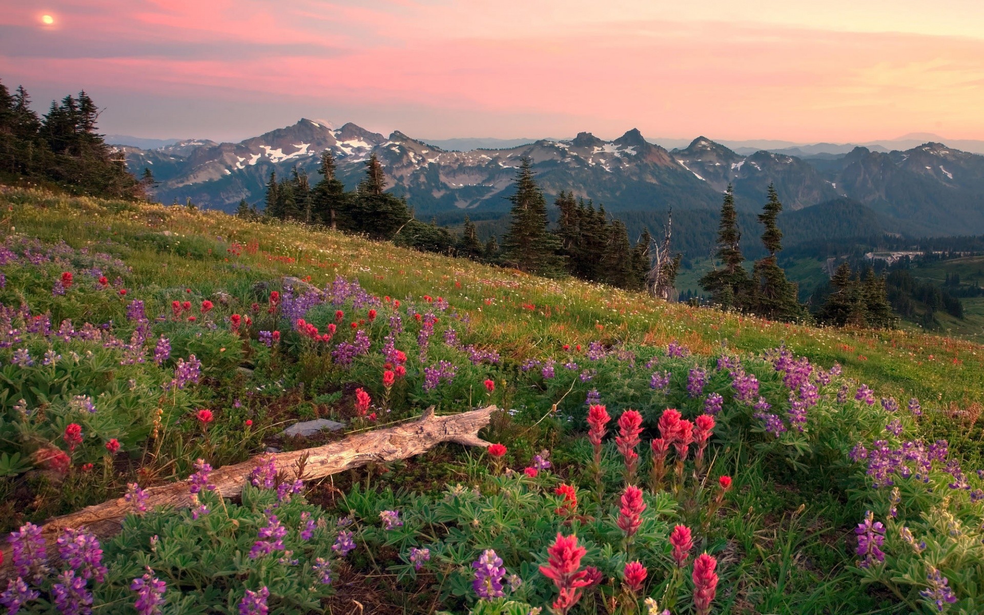 Um prado de montanha com flores roxas e carmesim e um tronco no fundo da montanha e o céu do pôr do sol no canto esquerdo do sol