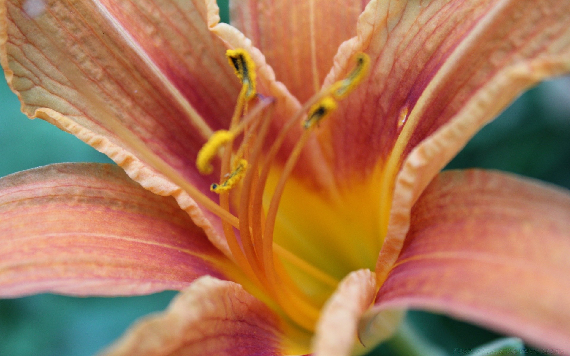 Flor amarelo-laranja com pistilos e estame com meio