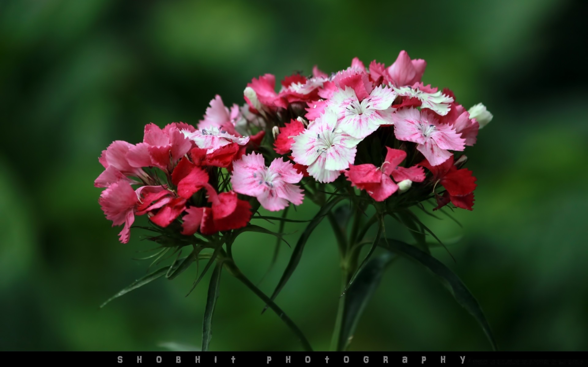 Flores multicoloridas salpicadas em um fundo verde