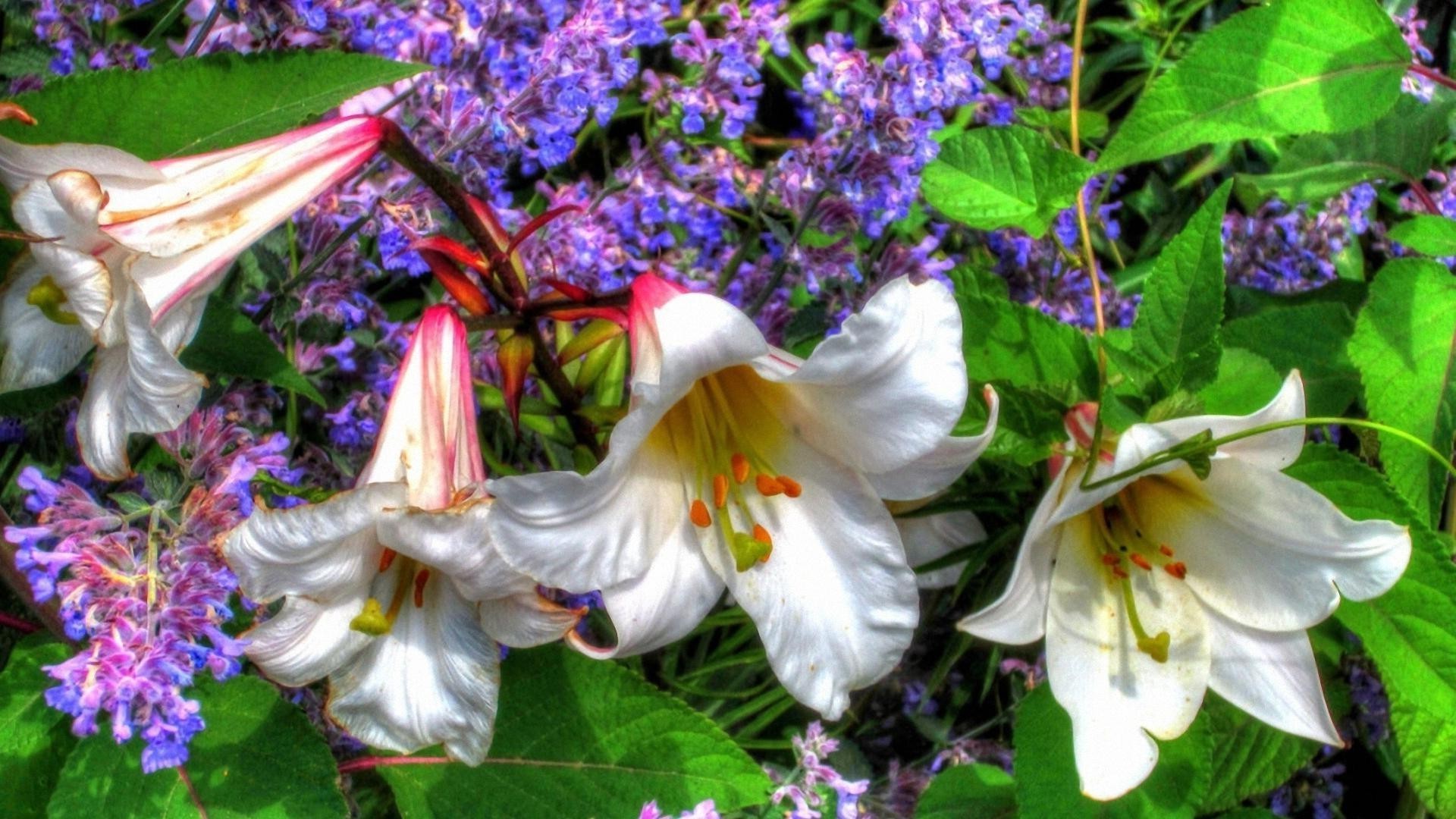 Flores de cerejeira florescendo entre a folhagem no fundo do céu azul