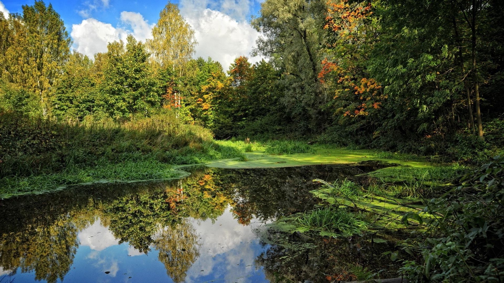 Por um lago pantanoso na floresta iluminado pelos raios do sol