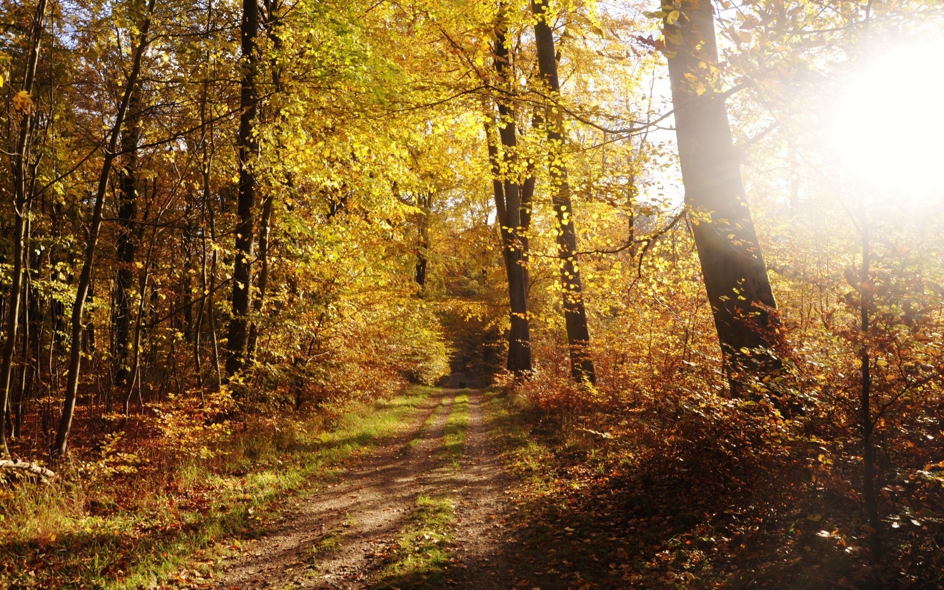 Árvores no fundo do sol do pôr-do-sol. Paisagem de outono