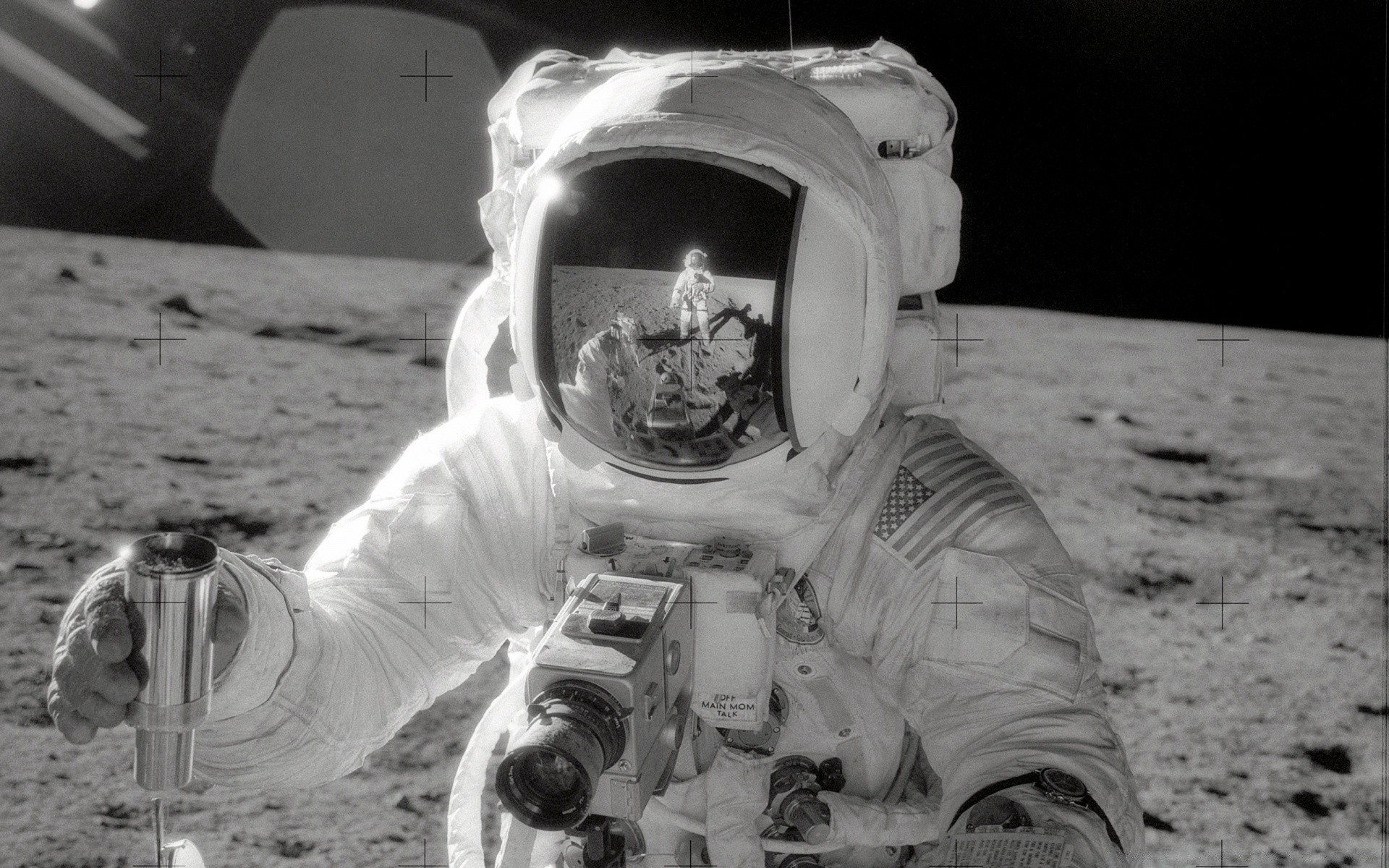 Foto em preto e branco de um astronauta na lua