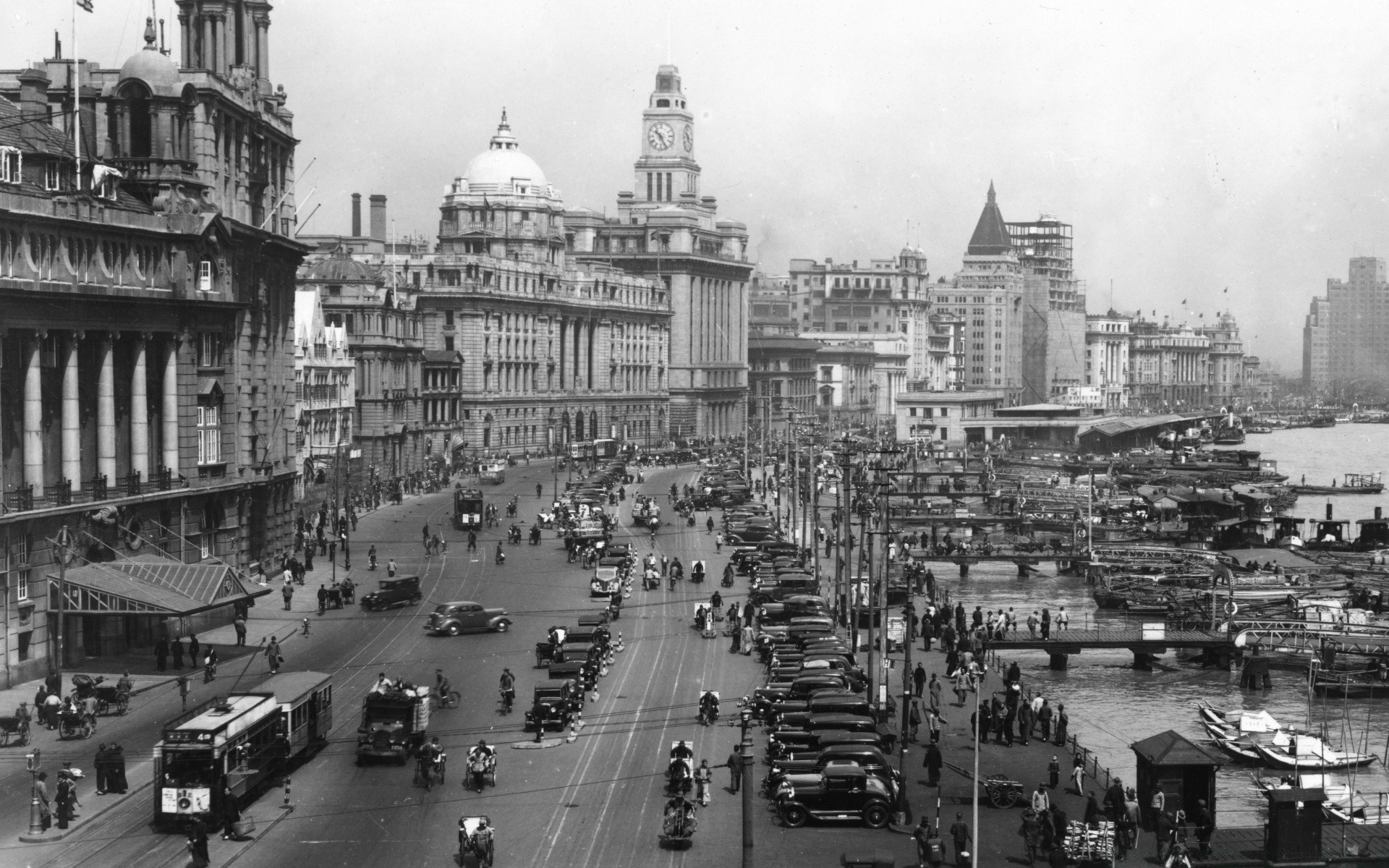 Foto antiga em preto e branco de um barco no fundo da cidade