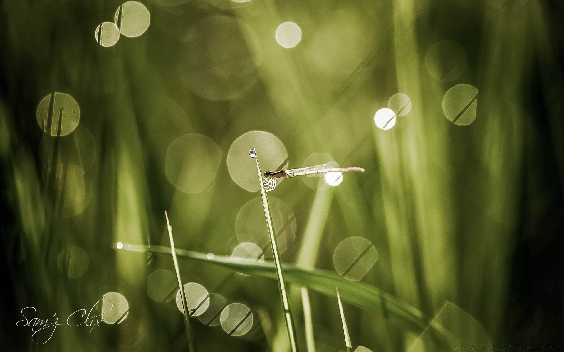 Grama desfocada com gotas de orvalho