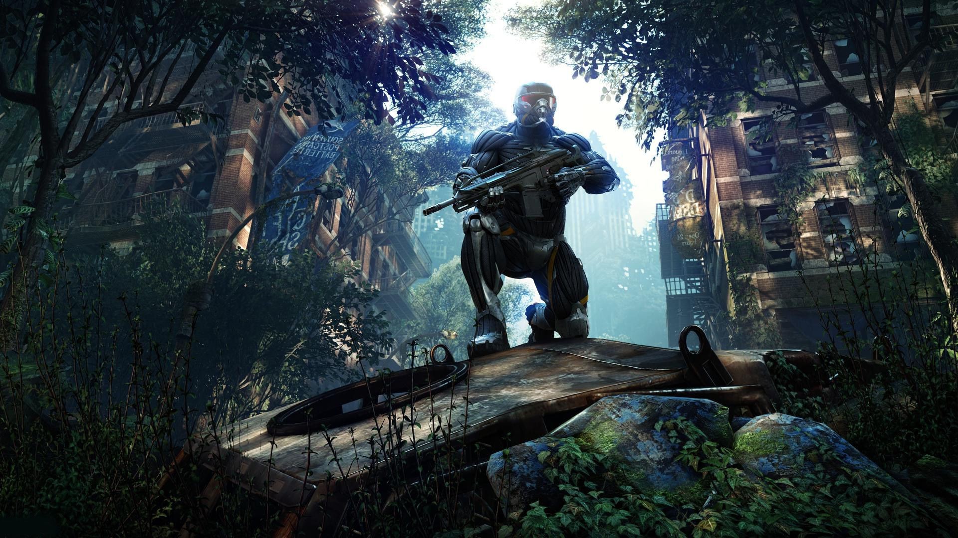 O herói do jogo Farcry 4 em um terno rosa, com um servo e uma arma contra o pano de fundo de uma paisagem de montanha