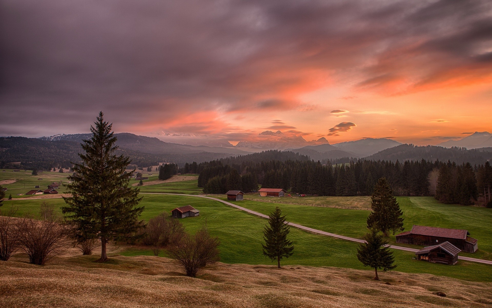 O pôr do sol, que se estende além da borda da floresta, é refletido na superfície da água