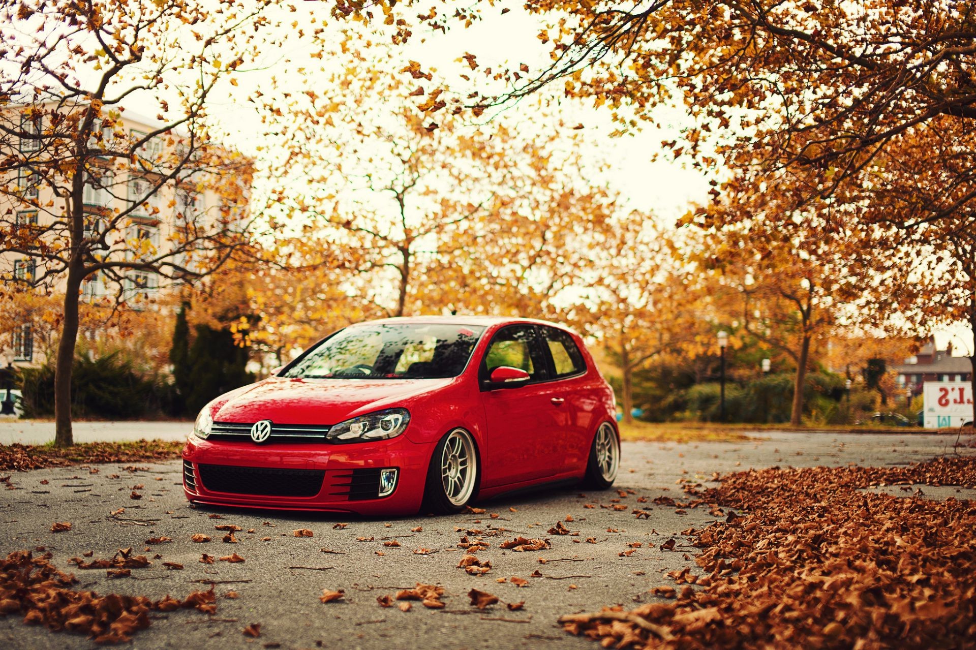Folzvagen de andorinha no outono contra o pano de fundo da cidade
