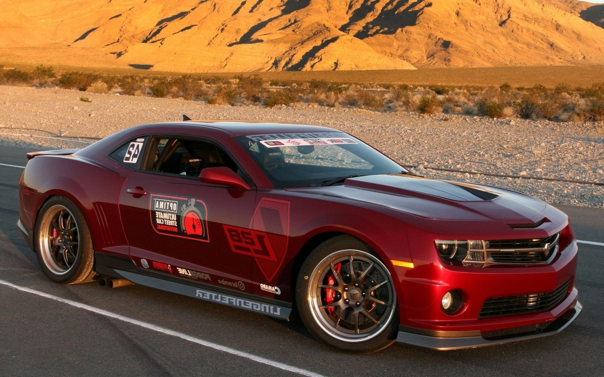 Carro esportivo vermelho no fundo da pradaria