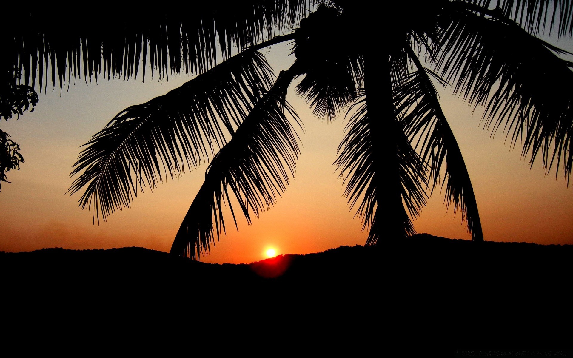 Céu laranja e pôr do sol contra o fundo de uma palmeira escuraCéu laranja e pôr do sol contra o fundo de uma palmeira escura