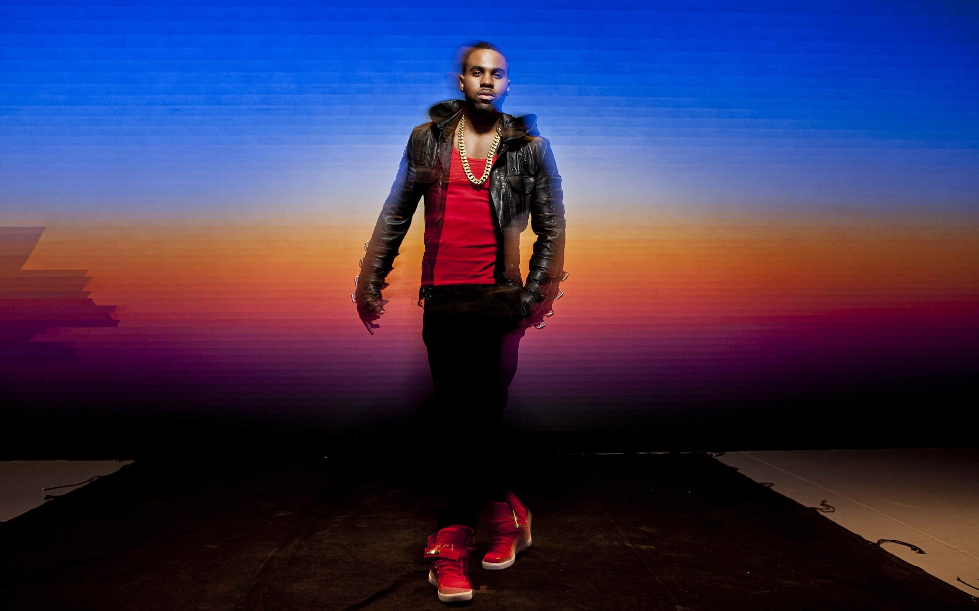 Músico afro-americano em uma camiseta vermelha, tênis e jaqueta em um fundo de arco-íris