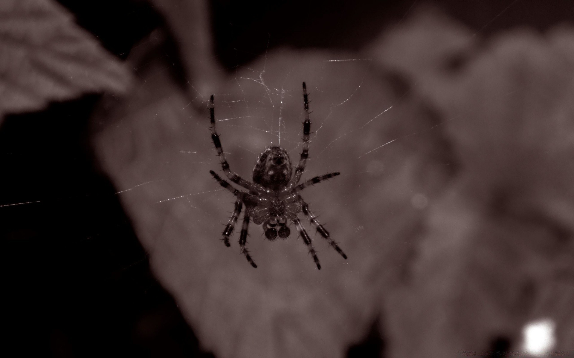Aranha na teia de aranha no fundo de folhas cinzentas