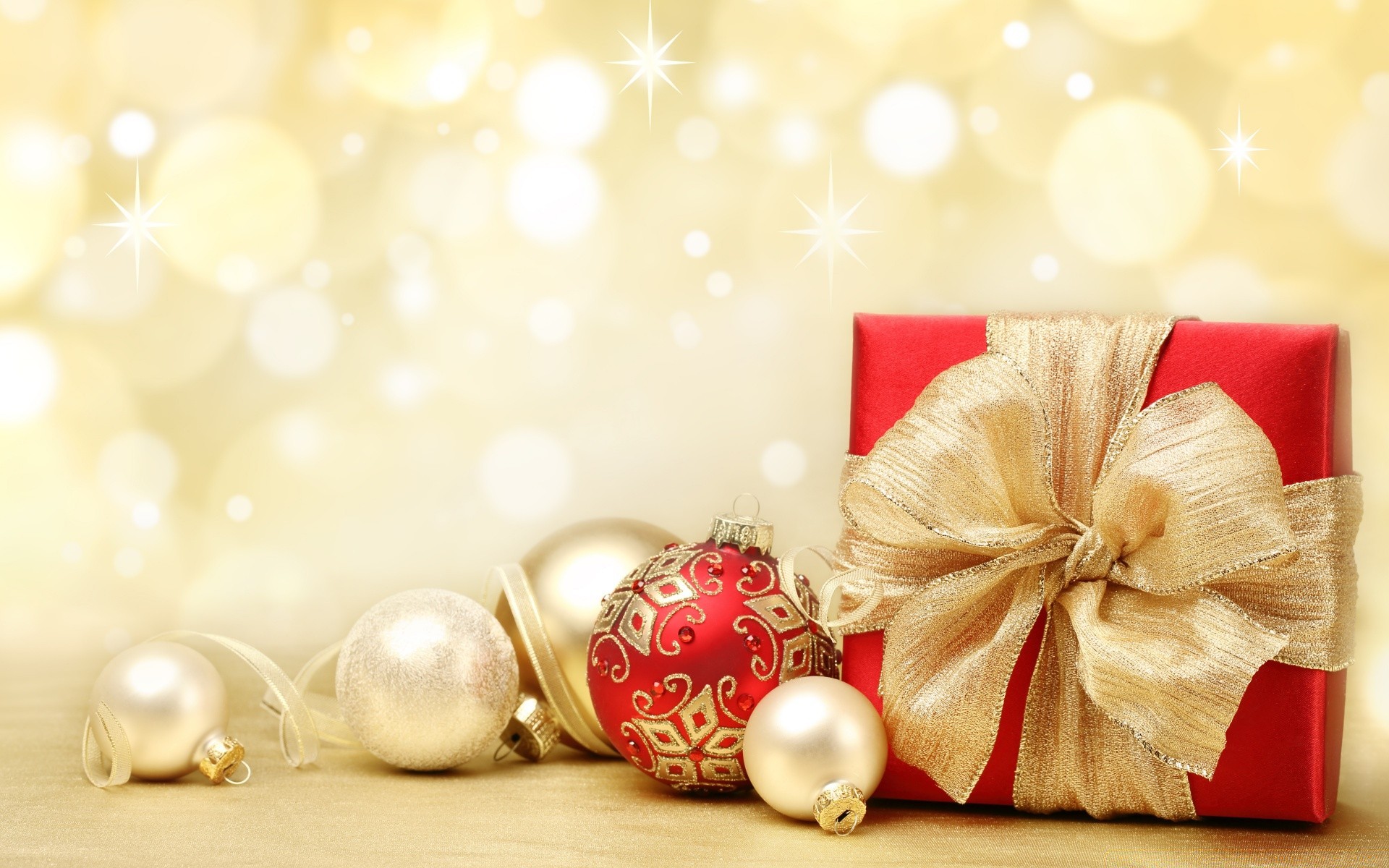 Inscrição verde em inglês com brinquedos de Natal pendurados em um fundo vermelho