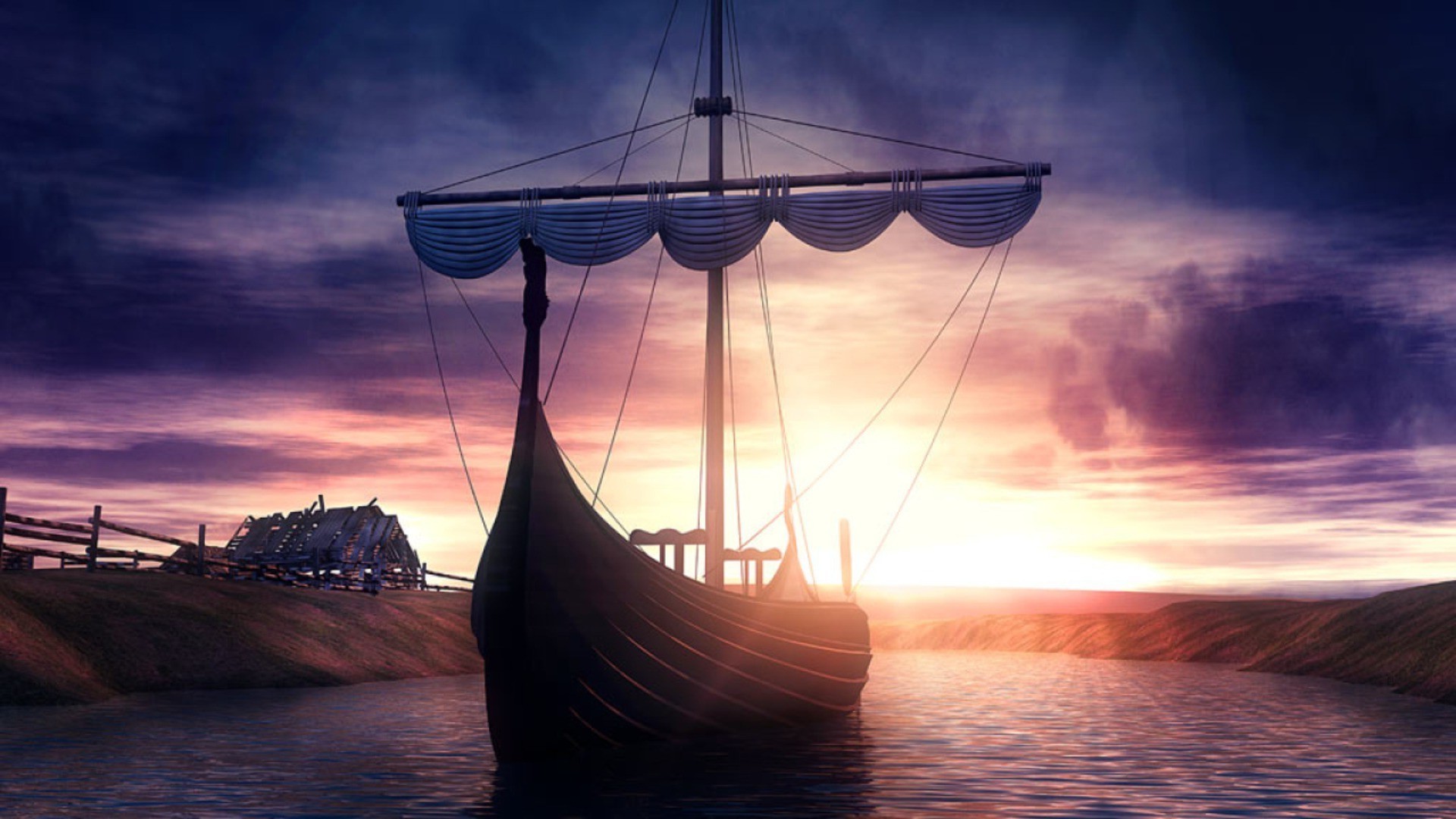 Costa do mar com um farol e um veleiro no fundo do sol cessante